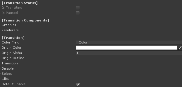 | UIState | The state of UI elements after a transition, including a Transform, a color, an alpha and an outline structure. Can be used on disable, on select or on click. |