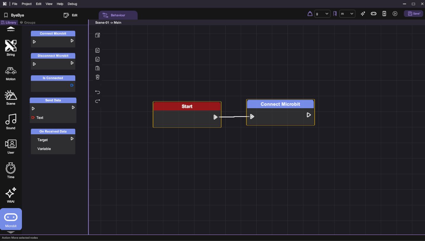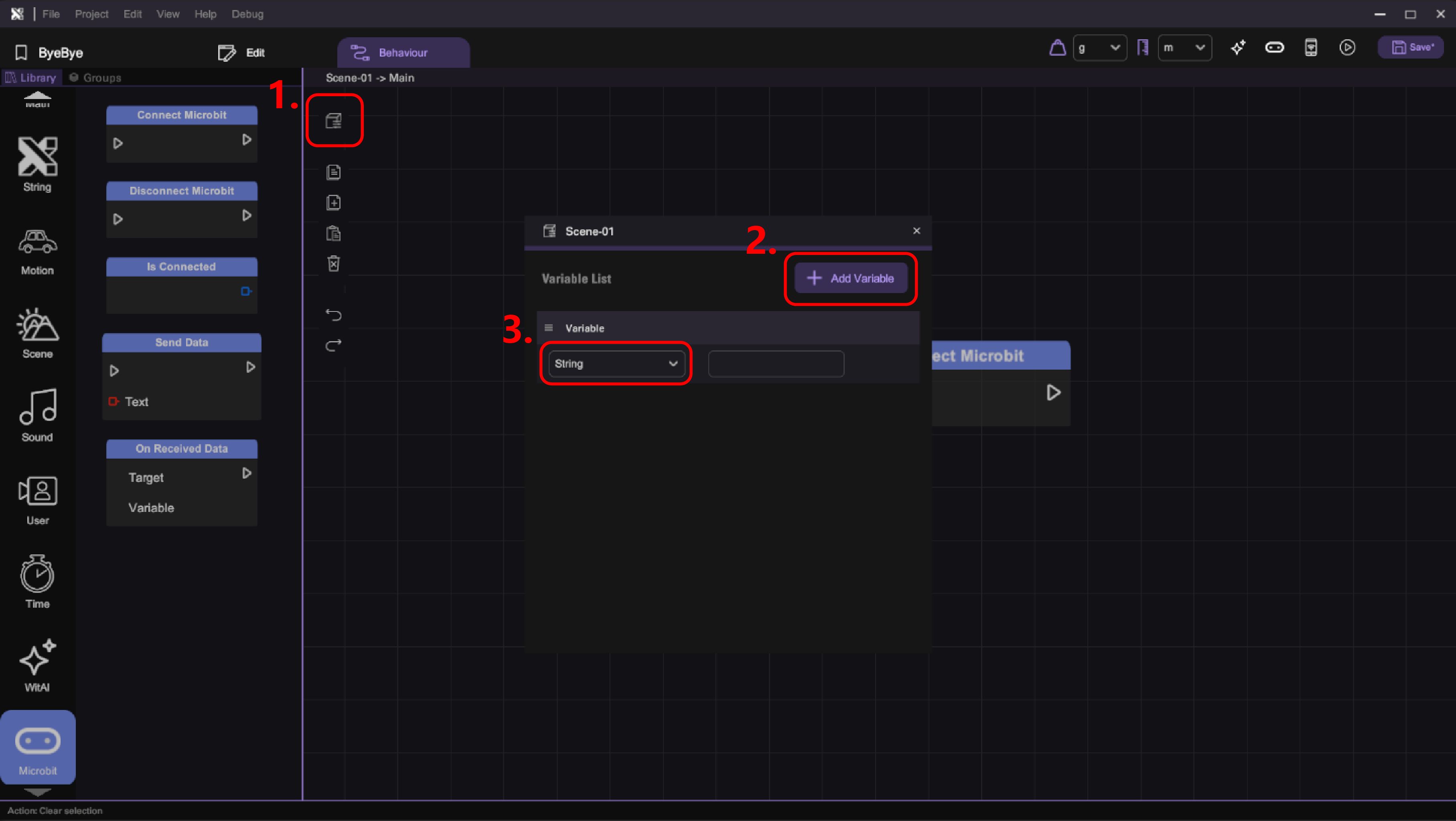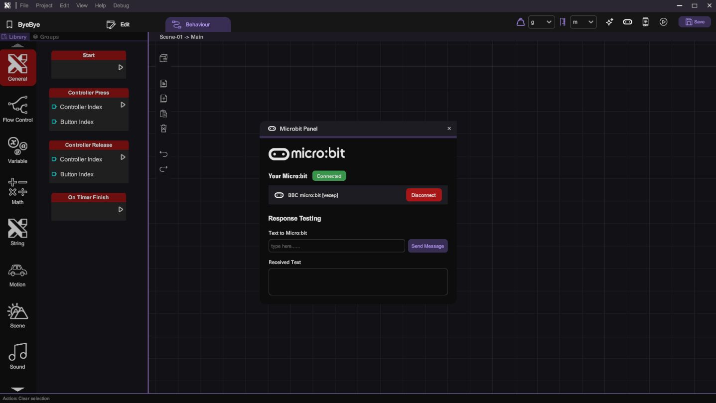 - Get Microbit data by using "On Received Data" behaviour block in play mode. The received data will stored into the "variable" variable.