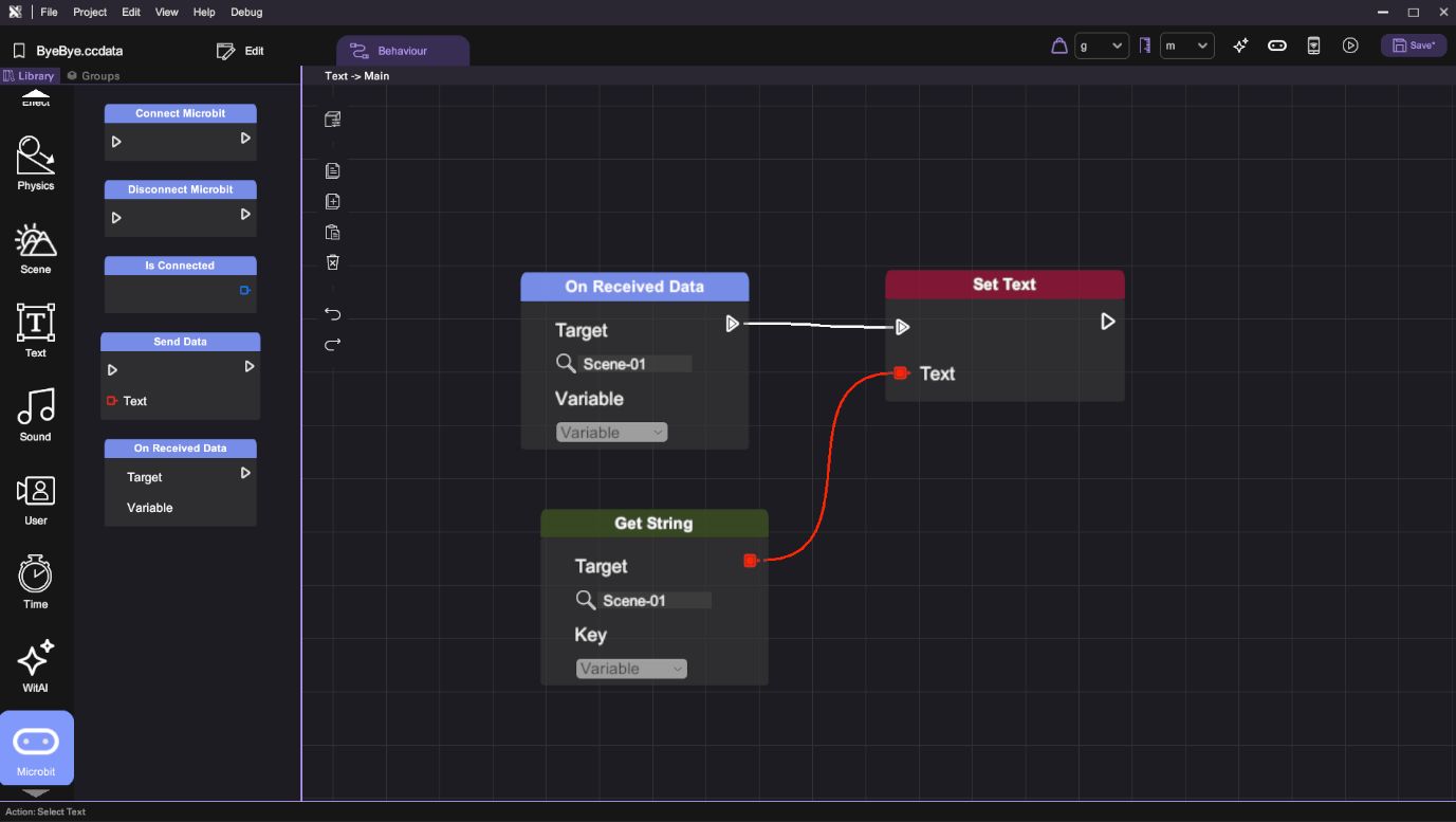 Ensure the "On Received Data" behaviour Block is called somewhere to store the microbit data to a variable. At this time, the block is called on the Text object if you have followed the above steps.