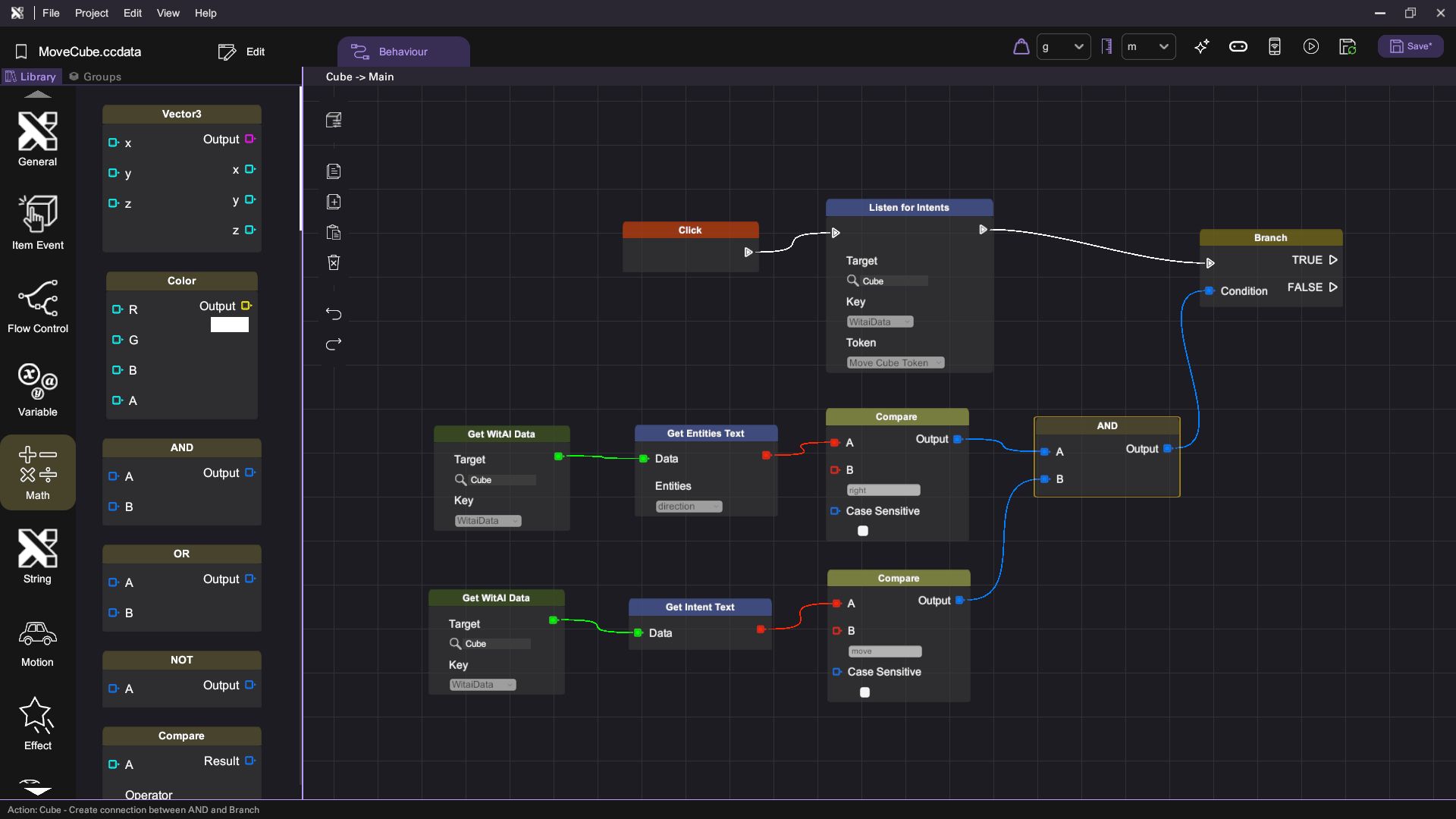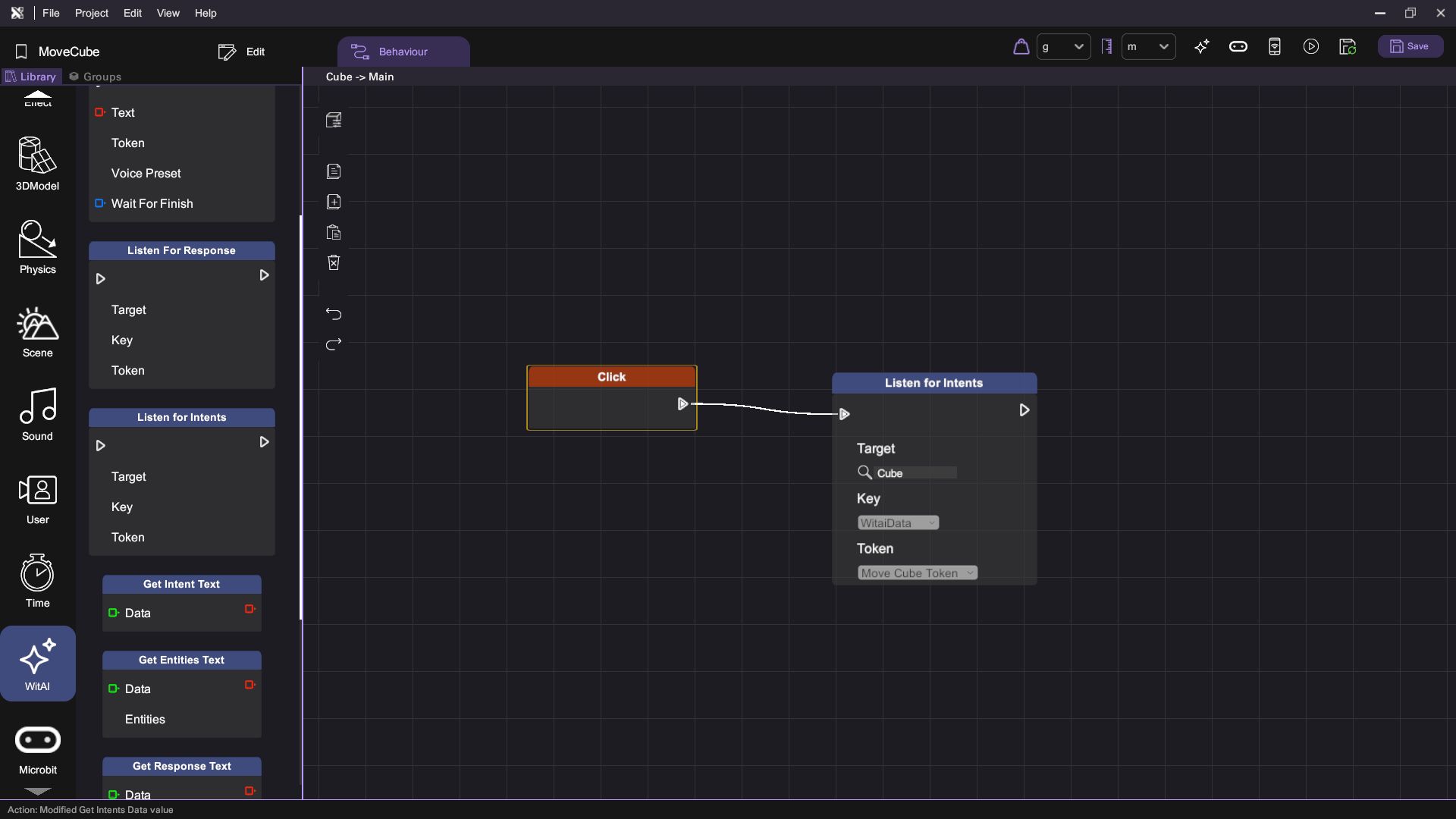 - Add a "Click" behaviour block and a "Listen for Intents" behaviour block to enable voice command recording when the cube is clicked.