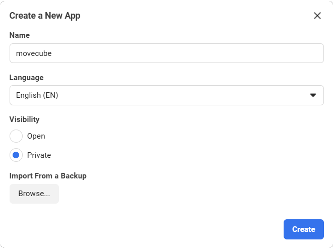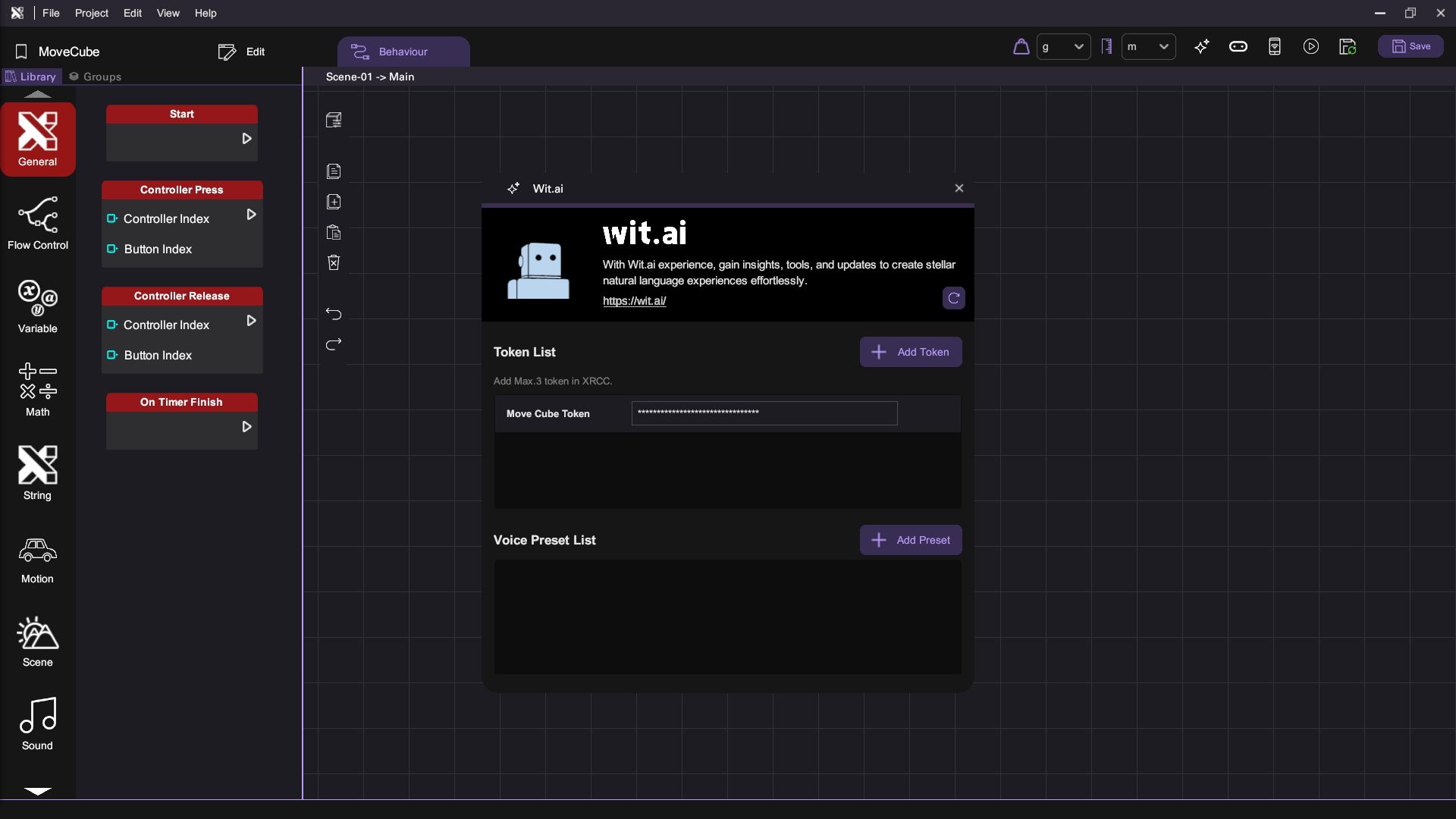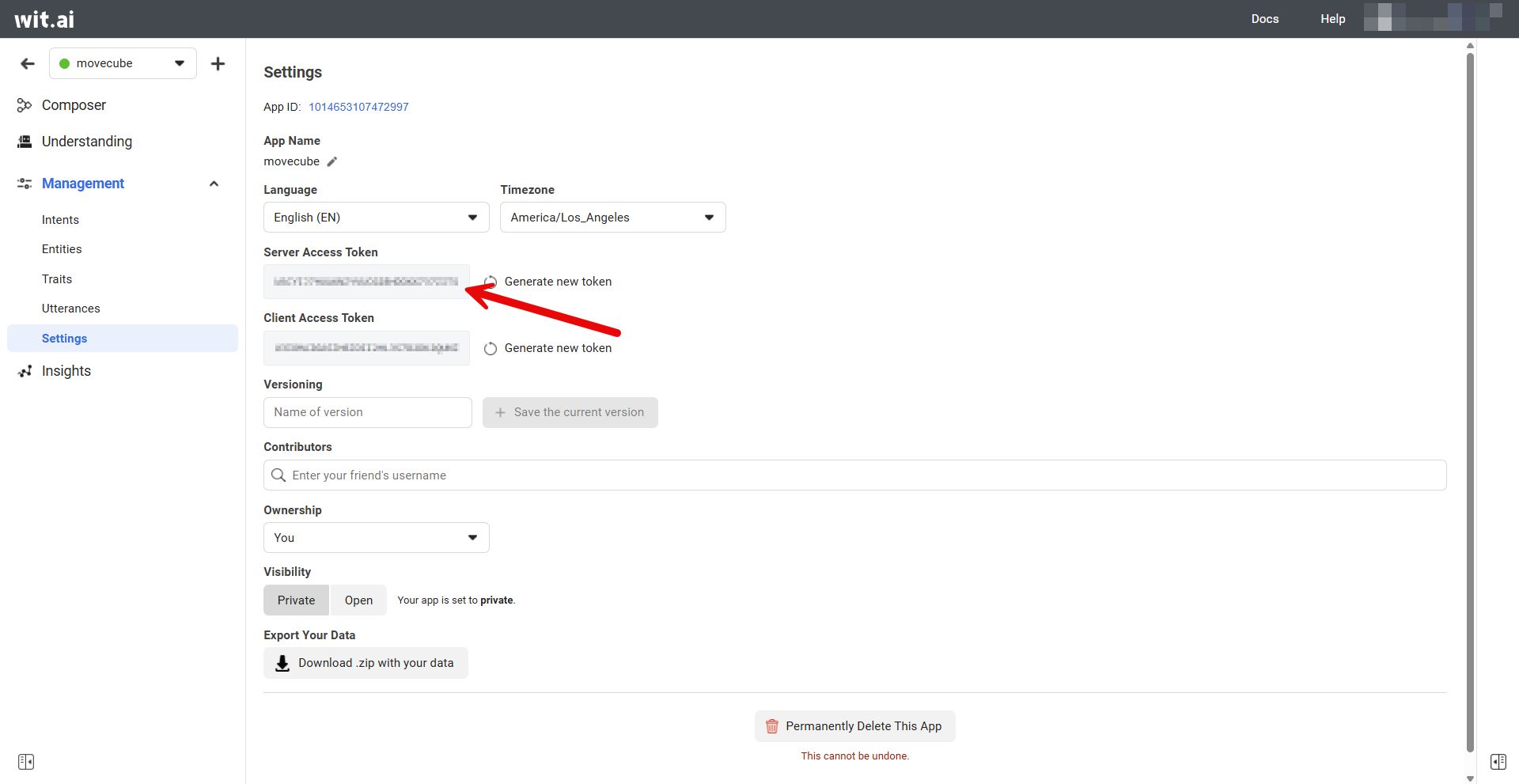 - Create a new app called "movecube" in Wit.ai