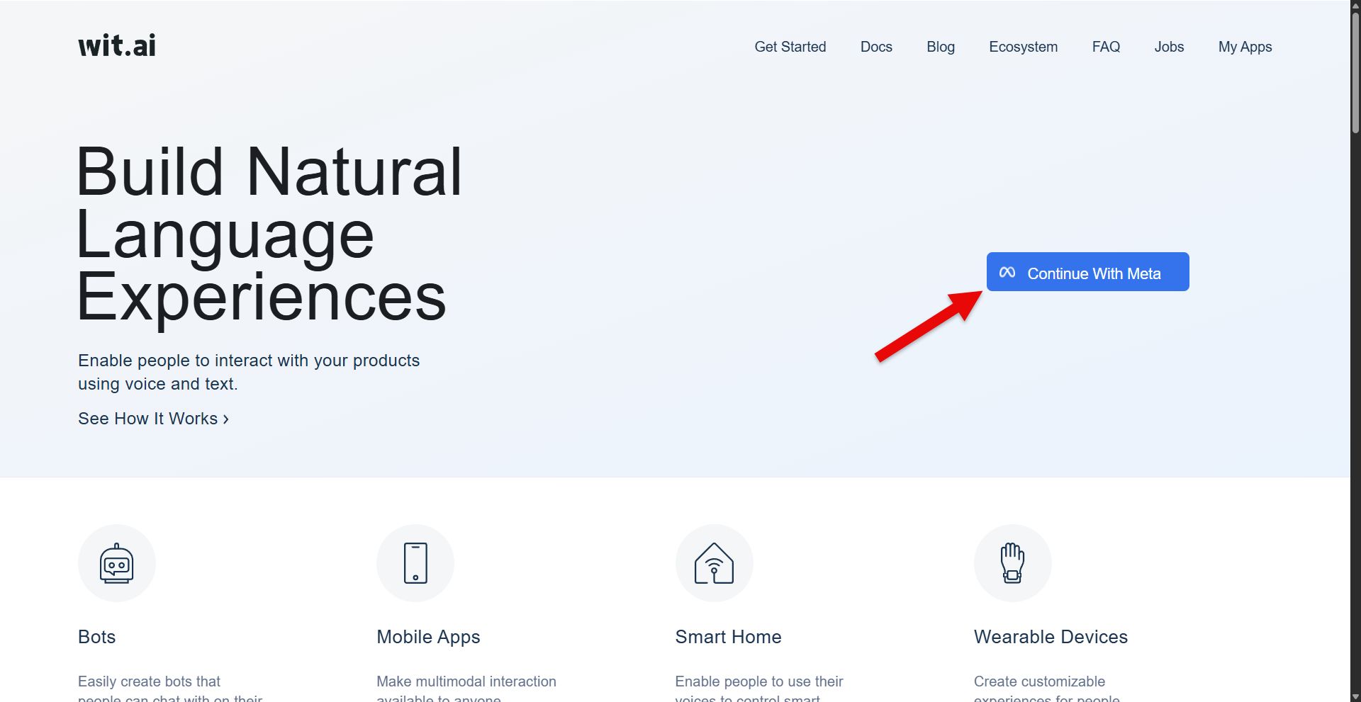 Go to the Wit.ai home page and sign in with your Meta account.