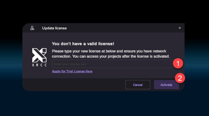When you launch XRCC PC without a validate license, a panel will stop you from loading and request a activation key.