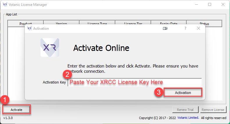 You will need to use the License Manager in VotanicXR Suite to activate the XRCC licenses. You can find the install link here.