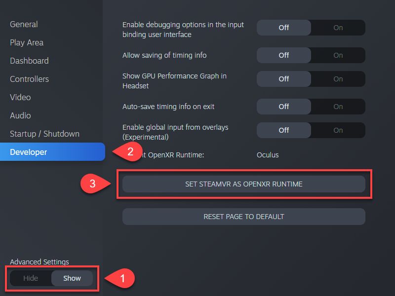 - Turn on Developer Settings and set SteamVR as Current OpenXR Runtime