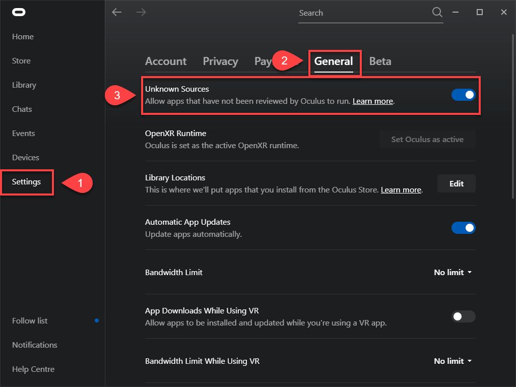 Open Oculus Settings and allow content from unknown sources