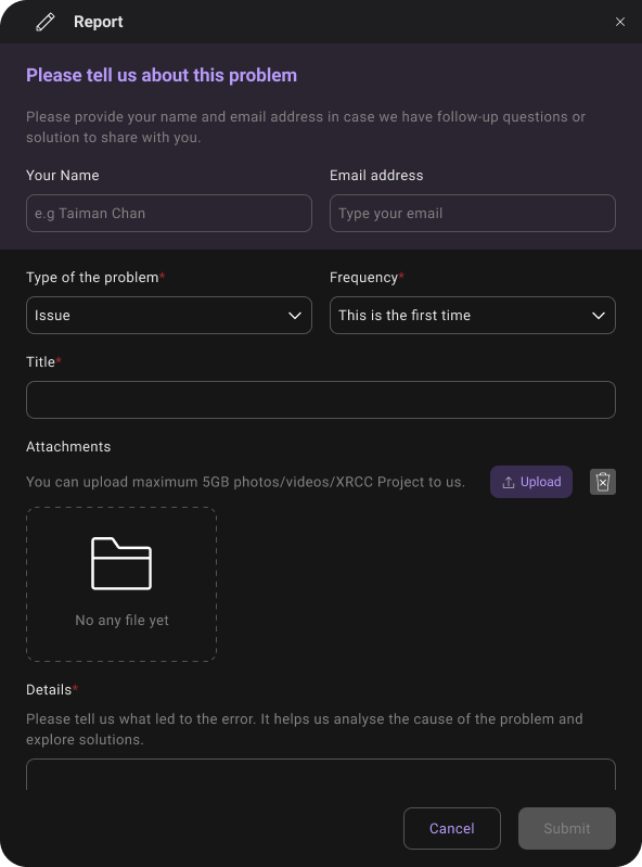 When you're done, click "Submit" to send off the report to the XRCC development team.