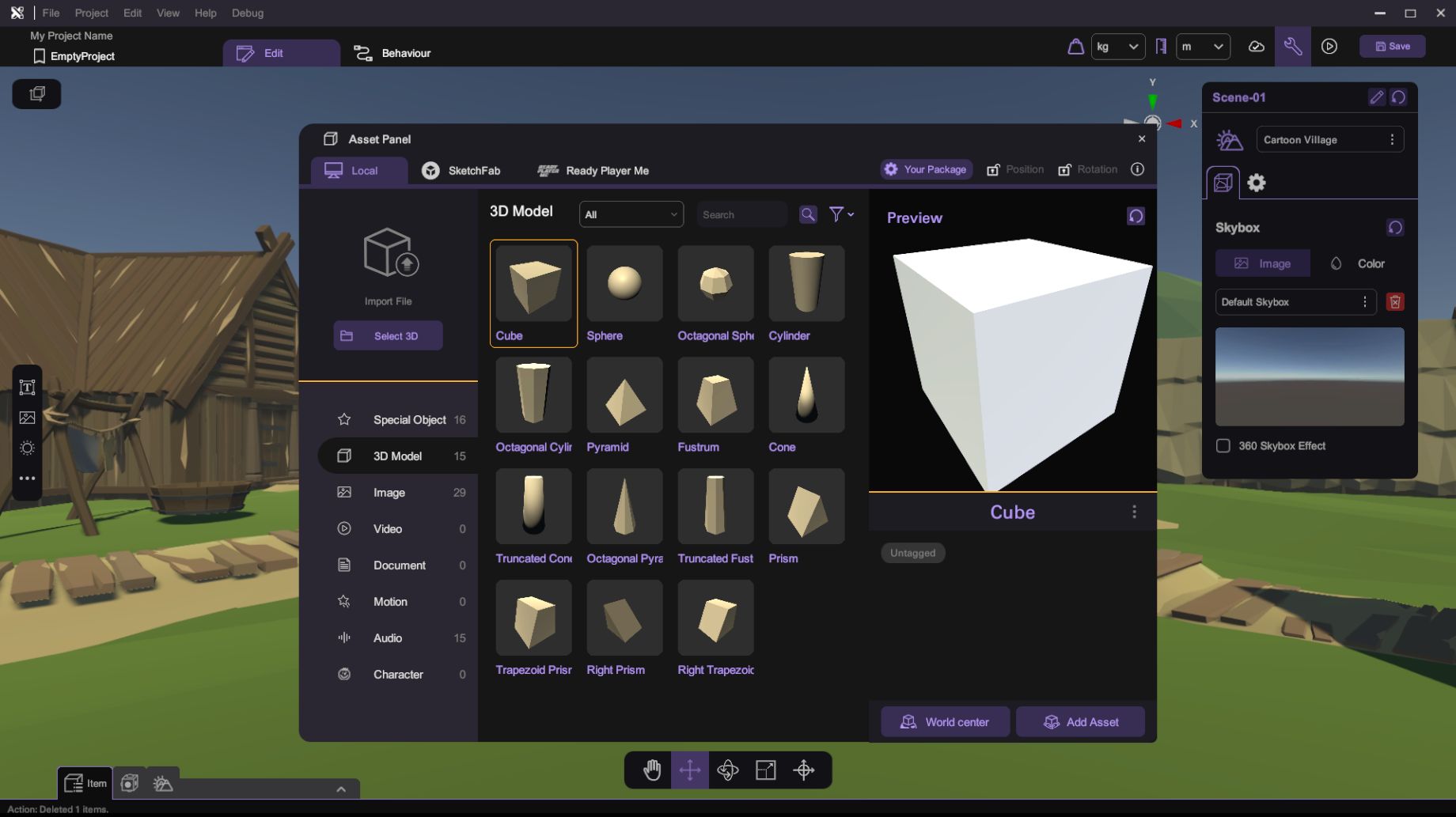 To delete an asset, click the "Delete" () button in the drop-down menu under the asset preview. A confirmation dialog box will appear, asking you to confirm the deletion of the asset. If you confirm, the asset will be removed from the Asset Panel.