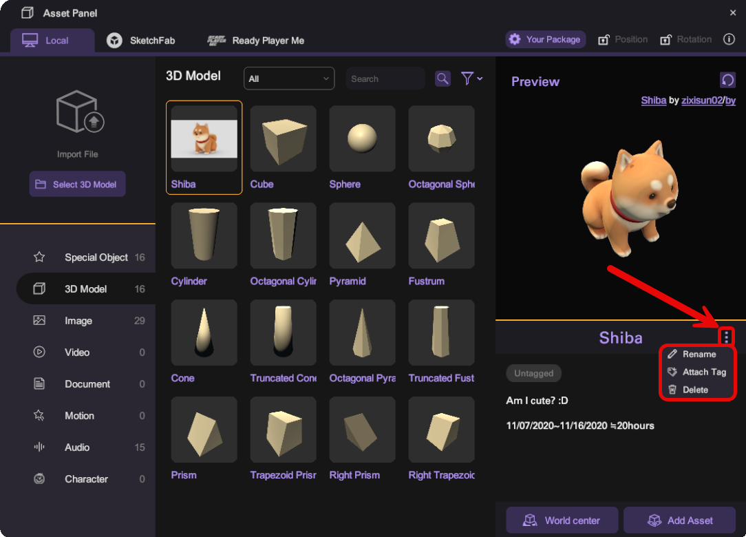 After selecting an asset, a preview will be shown in the preview area on the right. For user-imported asset, you will be able to rename and delete the asset by pressing "Rename" (), Tag () or "Delete" () in the drop-down menu under preview area.