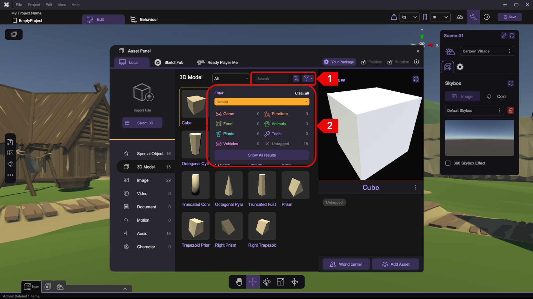 - To search for an asset by name, click the search bar at the top of the Asset Panel, enter the name of the asset you want to find, then press "Enter" or click the search button to filter the assets.