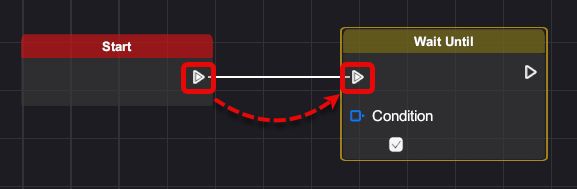 Behaviour flows from one behaviour block's output node to the next behaviour's input node, where the output and input's node type should match. For convenience, the nodes are color-coded to identify the type of values the different behaviour nodes will use: