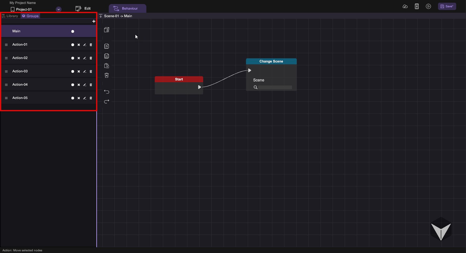 The Behaviour Group is designed with a main default action, but it also allows you to include multiple actions to improve organization and simplify the behaviour management process. This flexibility enables you to create more complex and structured behaviour hierarchies within your project.