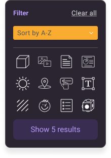 The object display order can be filterd using different filtering options. Press "Toggle Filter Menu" () to toggle the filter menu, you can choose from 3 types of sorting (Sort by "Recent", "Name: A to Z", "Sort by type").