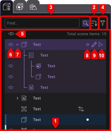 All objects added to the scene can be viewed from the Item Menu. To access the Item Menu, press the "Item Menu" () located at the (bottom-left menu (name not comfirmed)). In the menu, all objects in the scene including the parent/child relationship are displayed in a list, you will be able to select, search, sort, rename, delete and hide the object in the scene using the Item Menu.