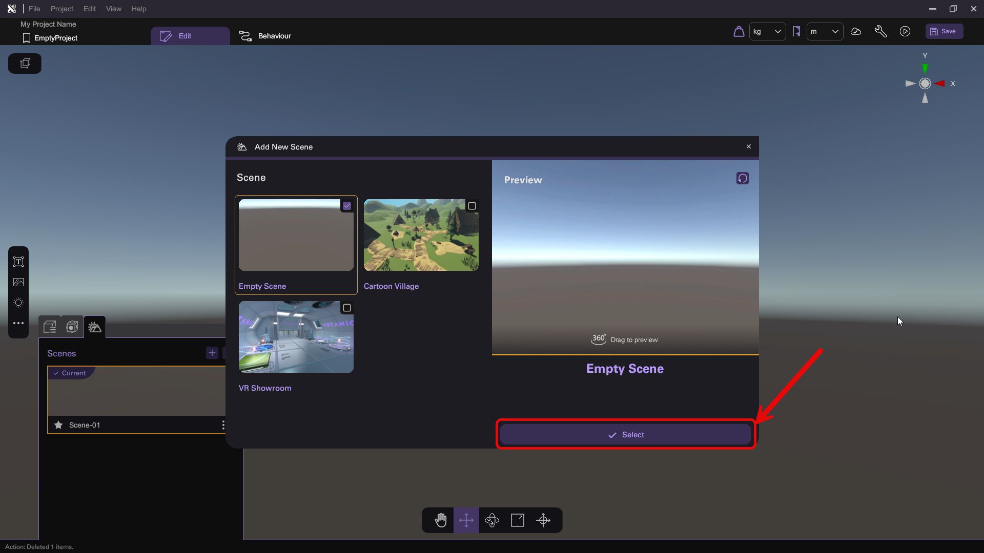 Choose a scene template from the list and a preview of the scene will be visualized in the Preview frame on the right. Click within the Preview frame and drag around to preview the scene in 3D, and confirm the selection by double-clicking the scene in the list or press "✔ Select"