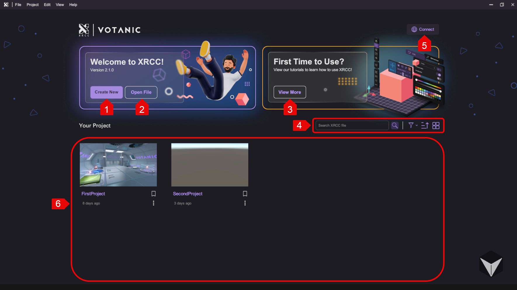 | 4 | Search area | Search projects by name and filter |