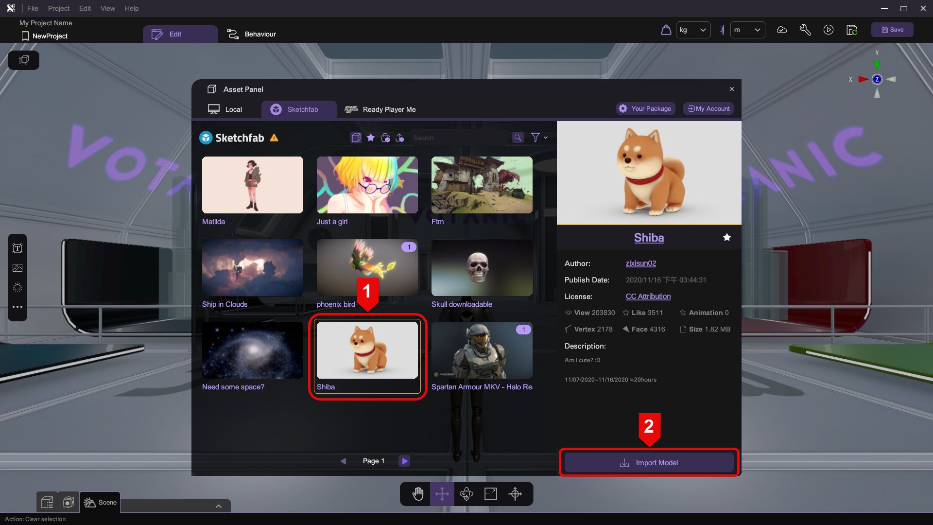 You can search and download 3D models from Sketchfab and import them for use in the project. In the Edit tab, press "Sketchfab Panel" () on the Toolbar to open the panel that allows you to browse 3D models from Sketchfab. The Sketchfab Panel contains 4 components as shown below.