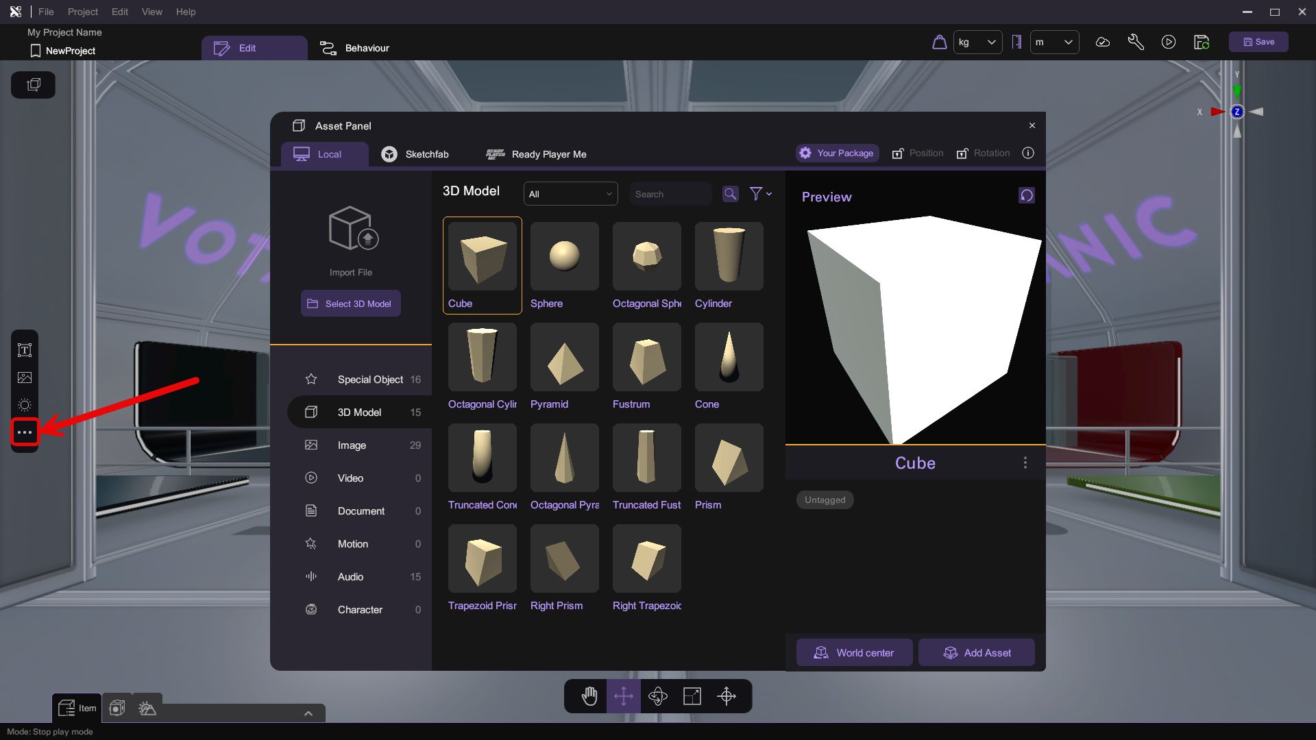 The panel displays all 3D model assets grouped by their theme. Select a model and press "World Center"/ "Add Asset" or double-click the model to spawn it in the scene as an object. The new object will spawn in front of you at the centre of the Scene View. Use the lock position / rotation buttons to add additional constraints when spawn objects to scene, and use the spawn button to select where you want the object to be spawned.