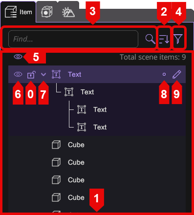 All objects added to the scene can be viewed from the Item Menu. To access the Item Menu, press the "Item Menu" () (B) in the Edit tab. In the menu, all objects in the scene including the parent/child relationship are displayed in a list, you will be able to select, search, sort, rename, delete and hide the object in the scene using the Item Menu.