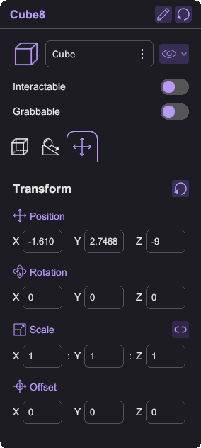 Press "Inspector" () (I) to toggle the Inspector Panel. The panel displays the detail of the selected object and allows you to modify various object properties. Some special objects have more unique settings that can only be assessed through the panel.