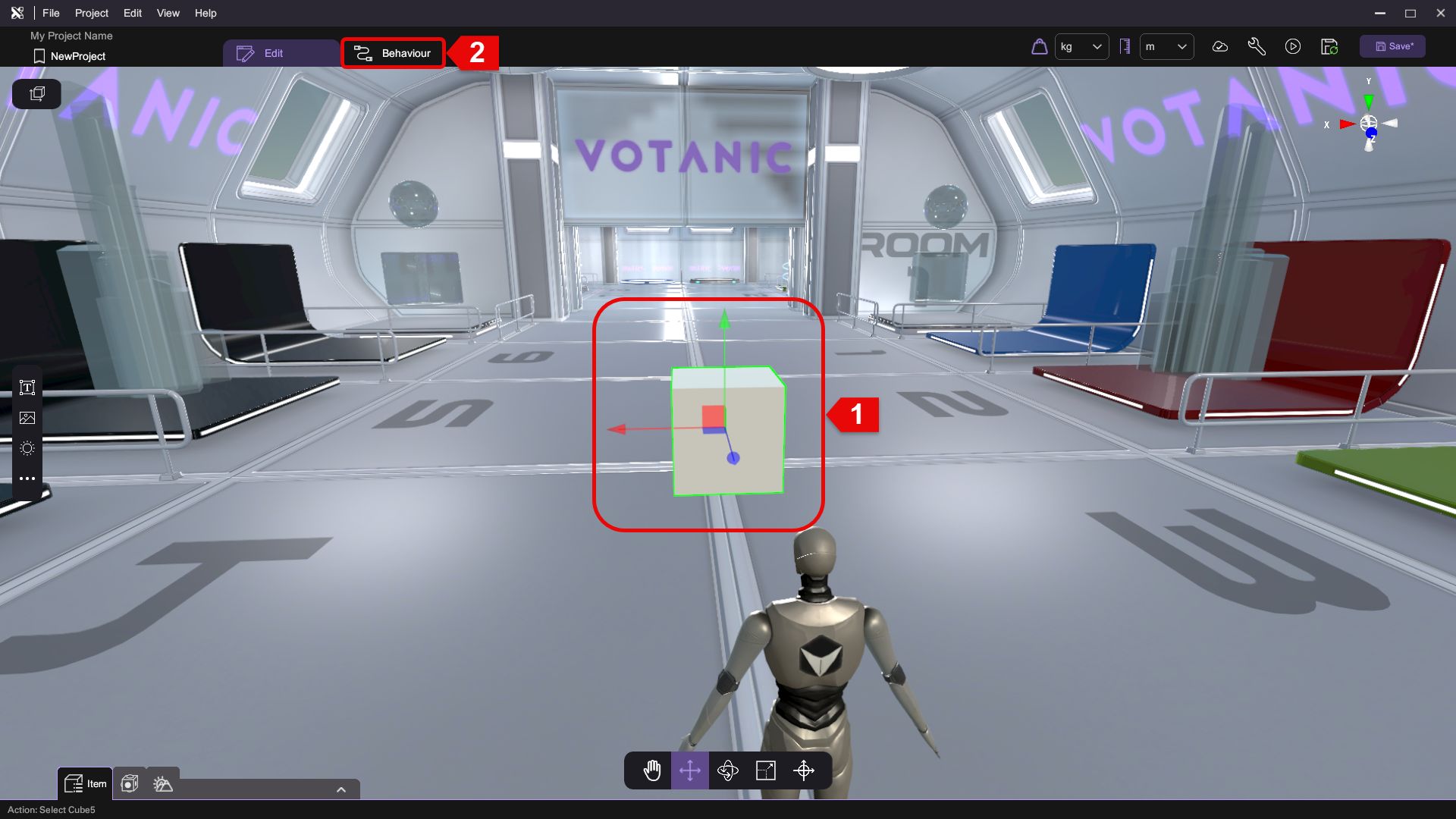 You can create and view behaviour by first select an object in the Scene View, then switch to the Behaviour tab to add or view behaviour for the selected object.