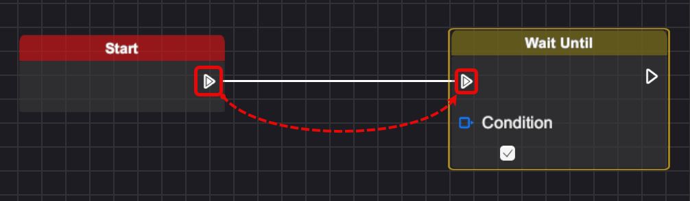 To create a behaviour, simply drag the behaviour blocks you need to the Behaviour Graph Panel and connect the blocks. Drag-and-release from the output node to the input node of the destined block to form a line.