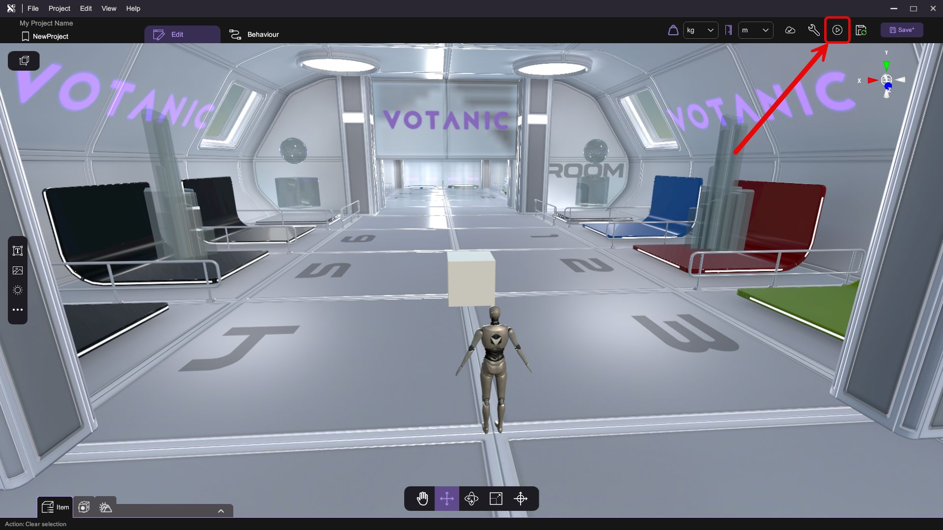 The Play Mode can be initiated by pressing "Play Mode" () in the Edit tab. During Play Mode, you assume the perspective of the robot in the scene and use the keyboard to control.