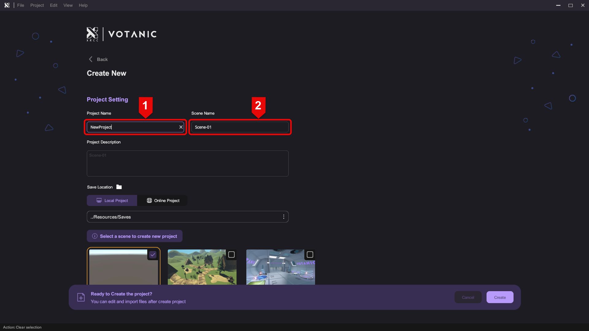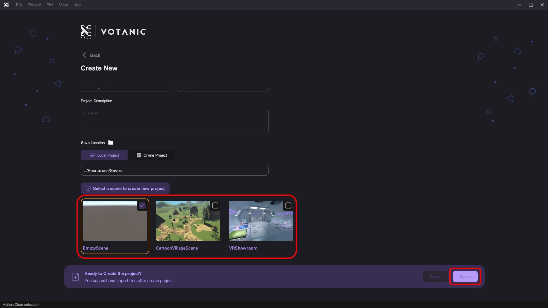 Select the start scene you want by pressing on the "Thumbnail", then click "Create" to create a new project.