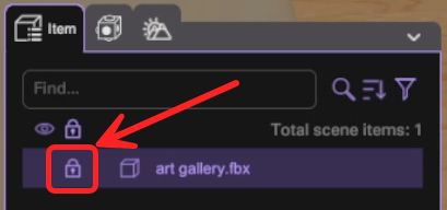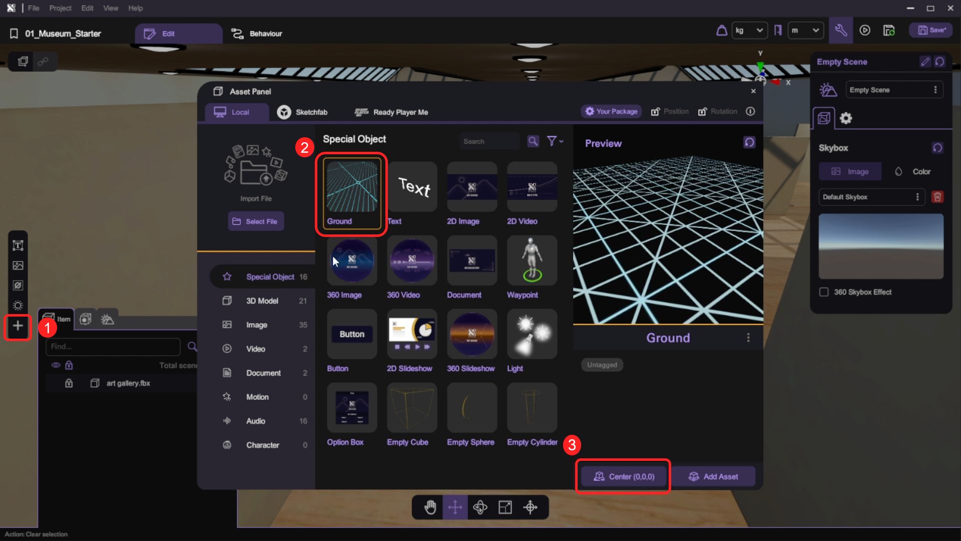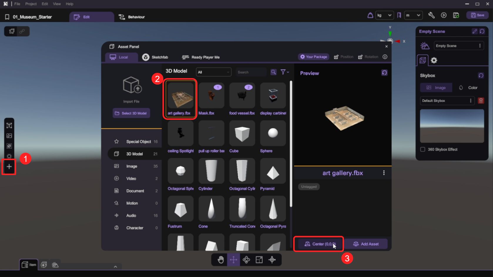 - From the Main Menu, select "File -> Assets Panel" (G) to open the Asset Panel. You can also access the panel by selecting the "More" button on the Assets toolbar on the left side of the scene view. Select the “art gallery.fbx” 3D model to add it to the world center of the scene by clicking World Center.