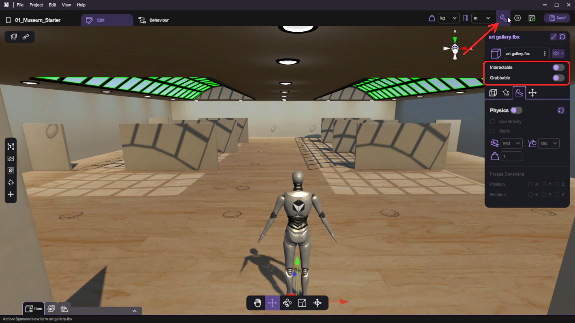 - Open the "Inspector" to see the detailed configuration of the asset. As the art gallery is just a background environment in the scene, deselecting Interactable prevents the VR wand from interacting with the object.