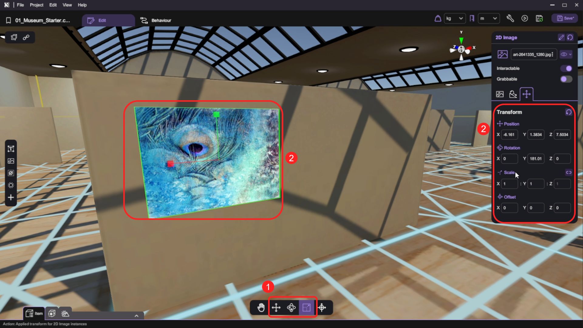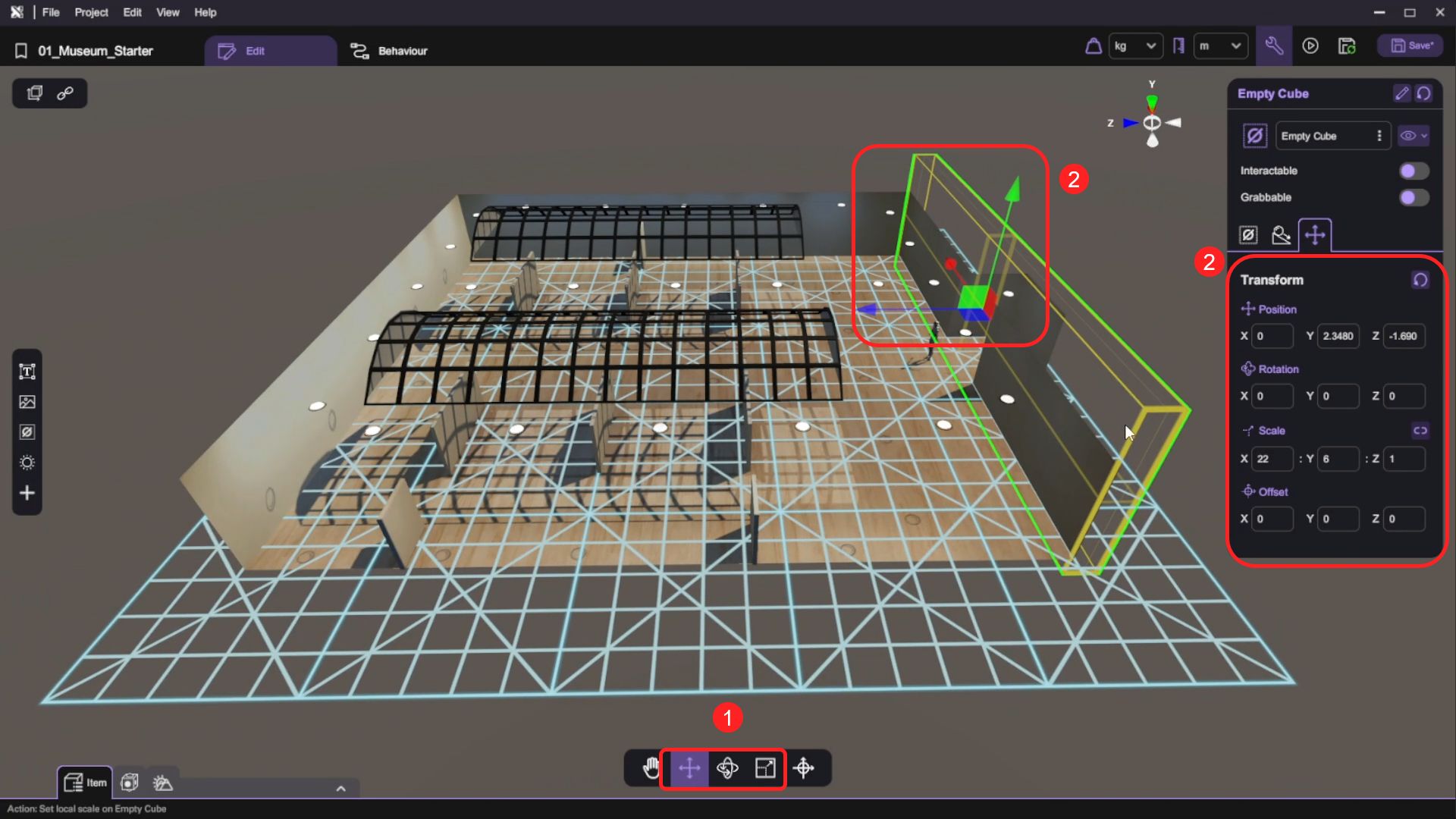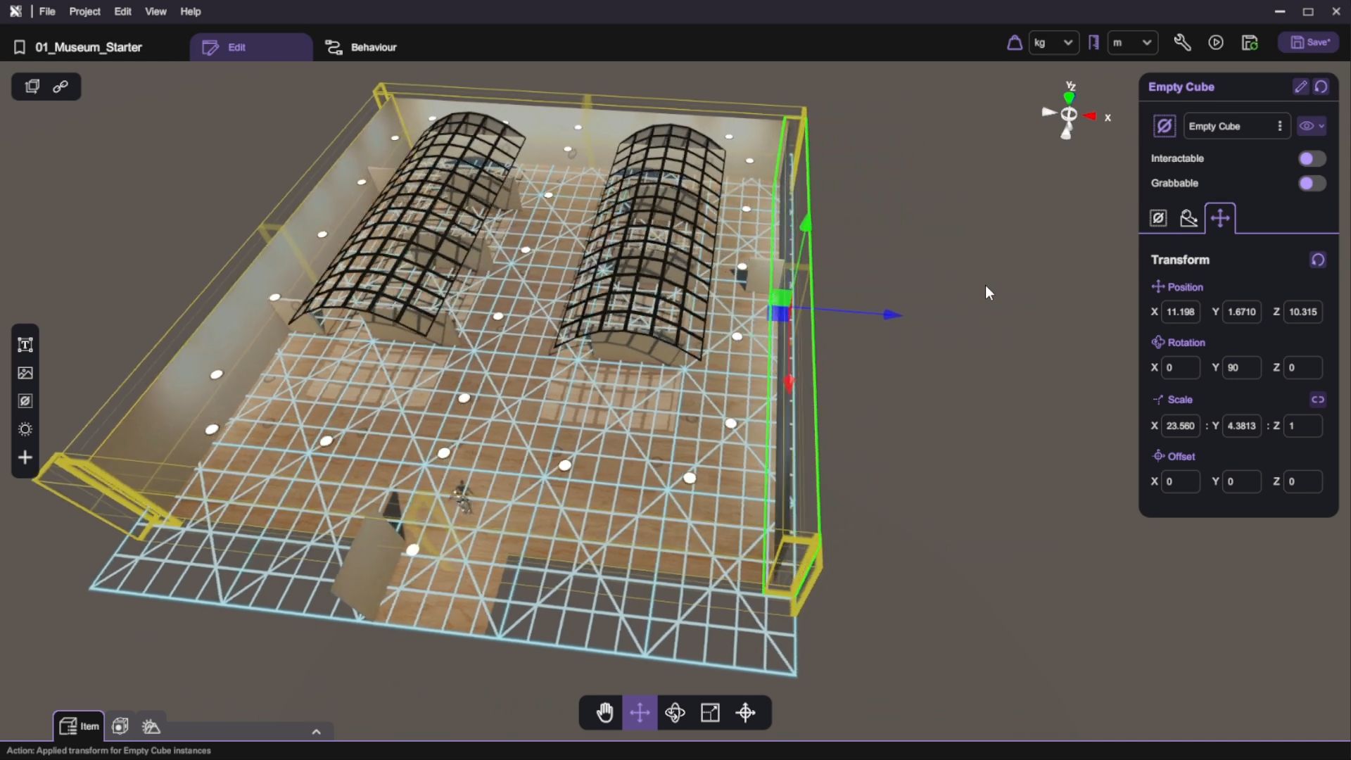 - Use the transform tools (move/rotate/scale) to adjust the size and position of the empty object so that it completely surrounds the wall surface of the art gallery's entrance behind the user.