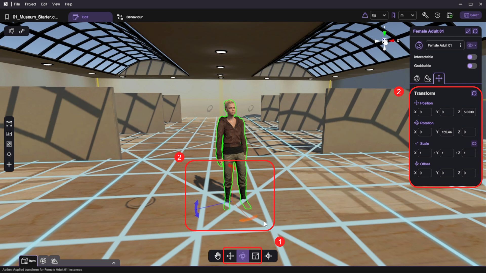 - Use the transform tools (move/rotate/scale) to reposition the character to in front of and facing the user.