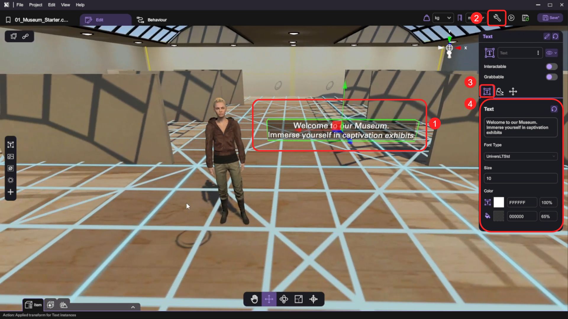 - Use the transform tools (move/rotate/scale) to reposition the text object next to the female character. Then open the "Inspector" to set up the text content, font size, and color of the text object.