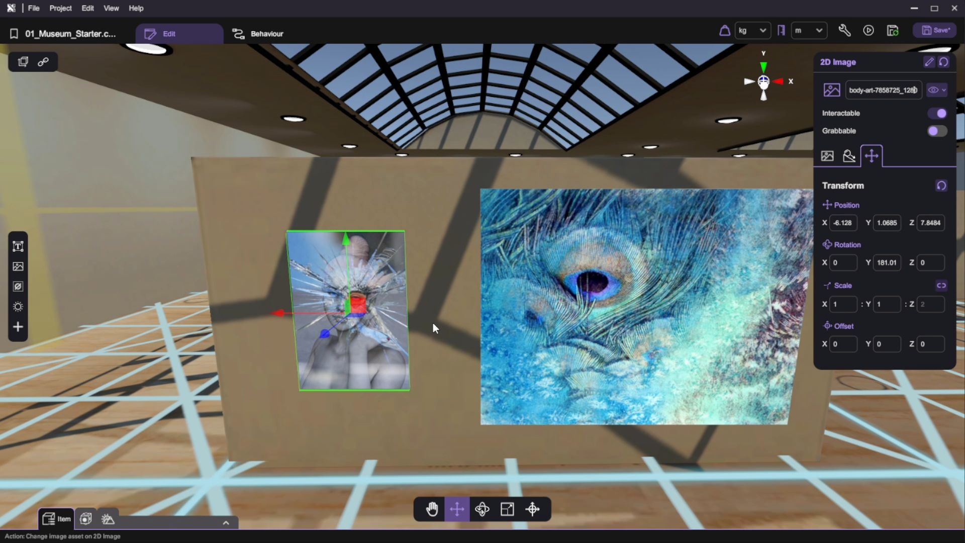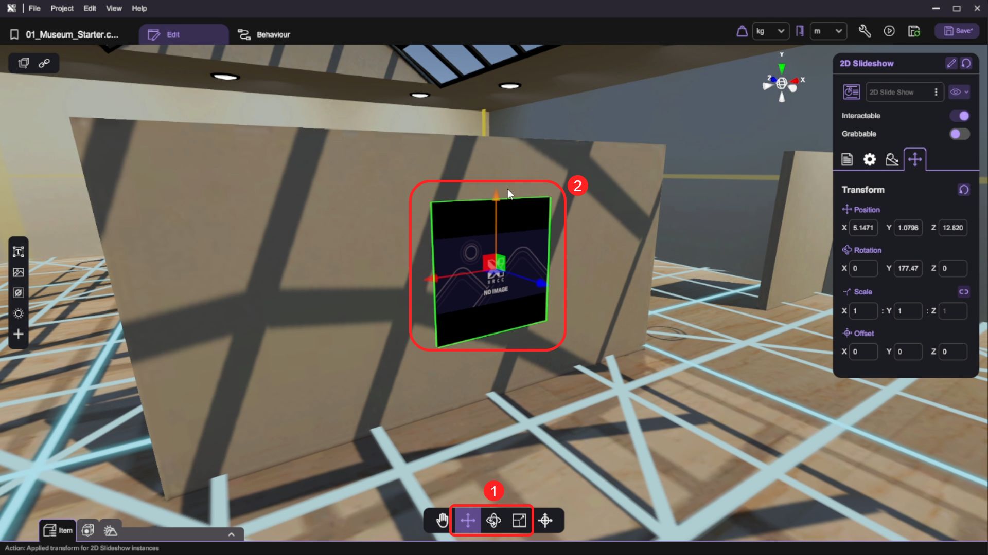 - Use the transform tools (move/rotate/scale) to place the 2D slideshow object on the left wall of the art gallery.