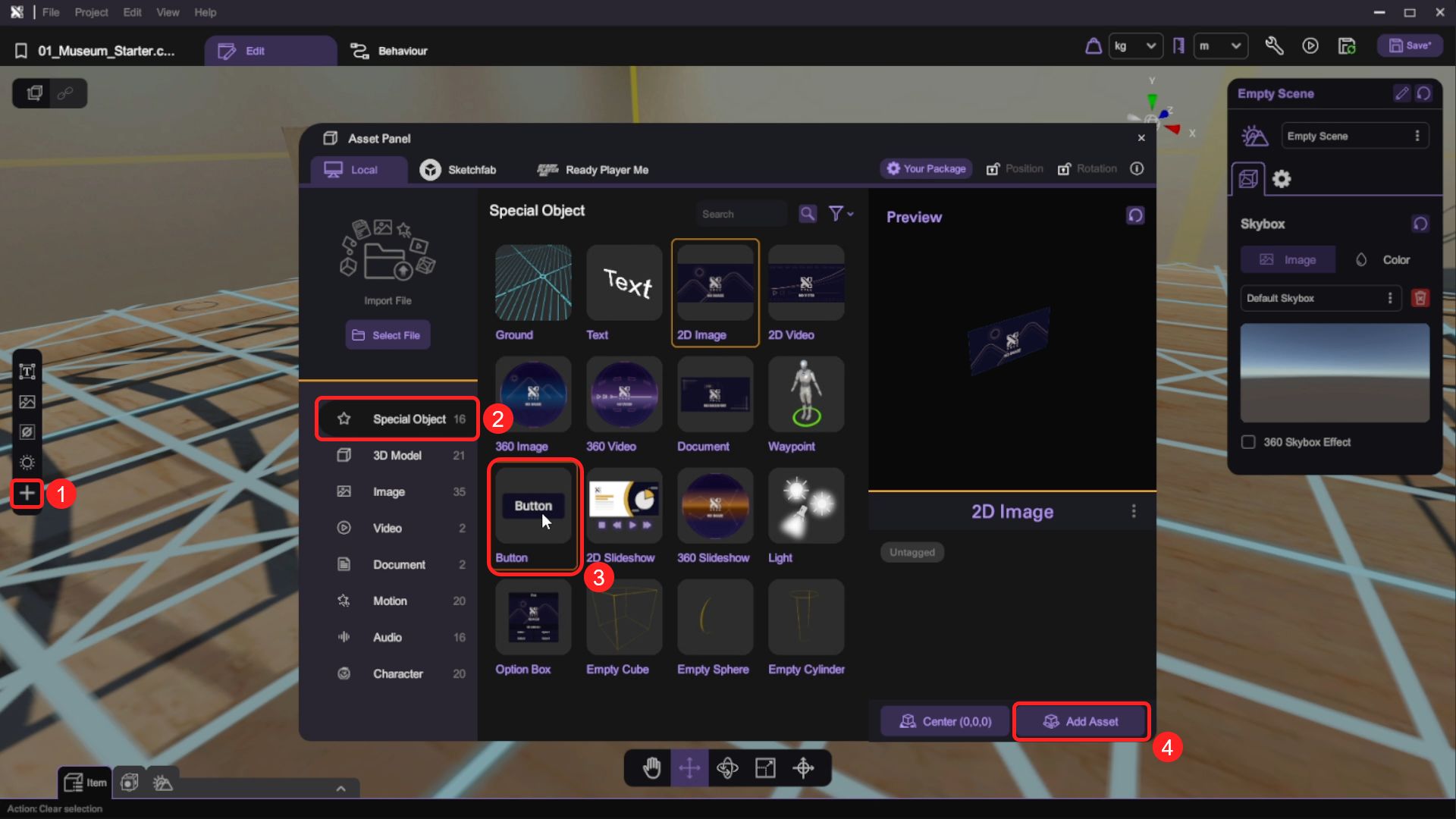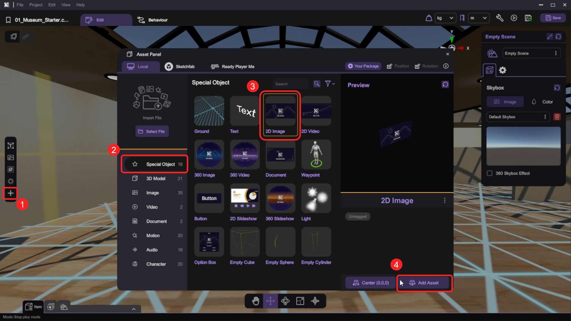 - Open the "Asset Panel" and from the "Special Objects" tab, select and add a "2D Image" to the scene.