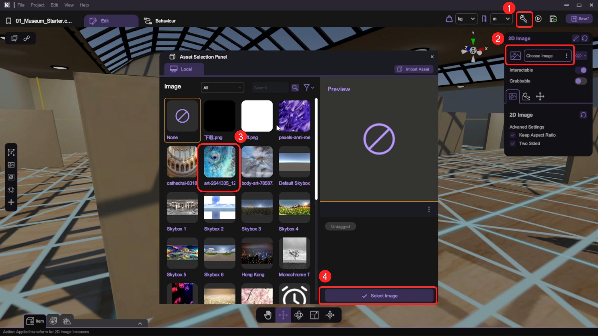 - Open the "Inspector", click the selector next to the "Image Asset" option to open the Selection panel and select an image in your asset library to display the image in scene.