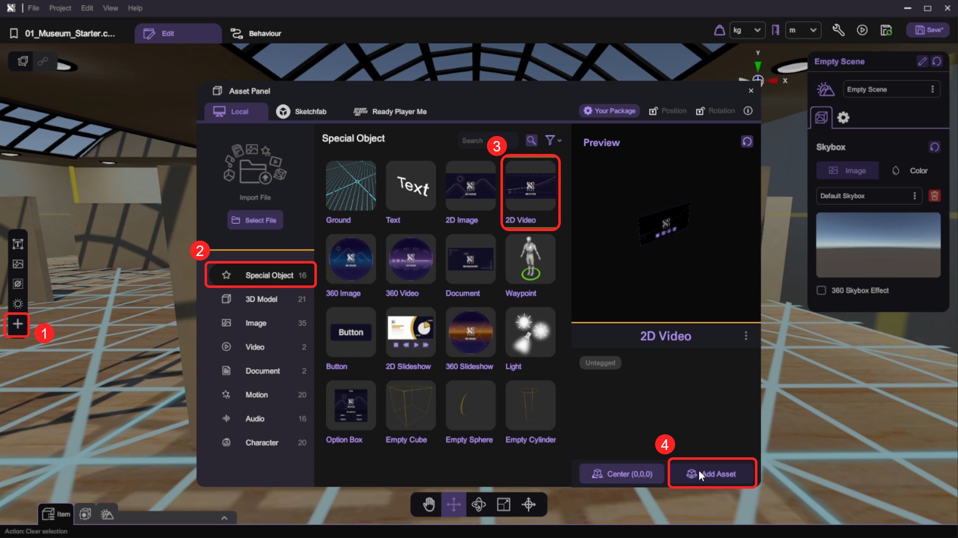 - Open the "Asset Panel" and from the "Special Objects" tab, select and add a "2D Video" to the scene.
