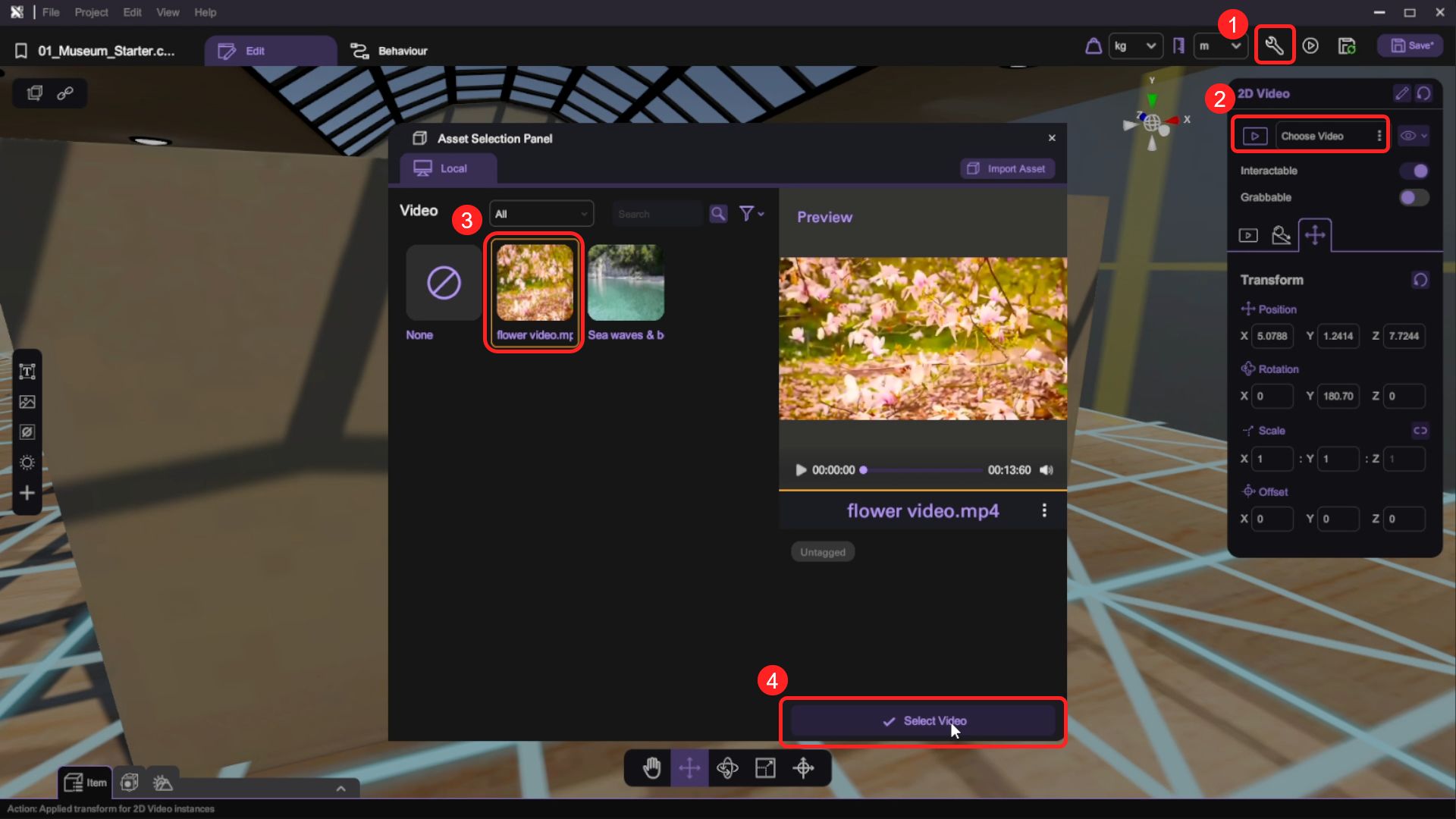 - Open the "Inspector", click the selector next to the "Video Asset" option to open the Selection panel and select a video in your asset library to play the video in scene.