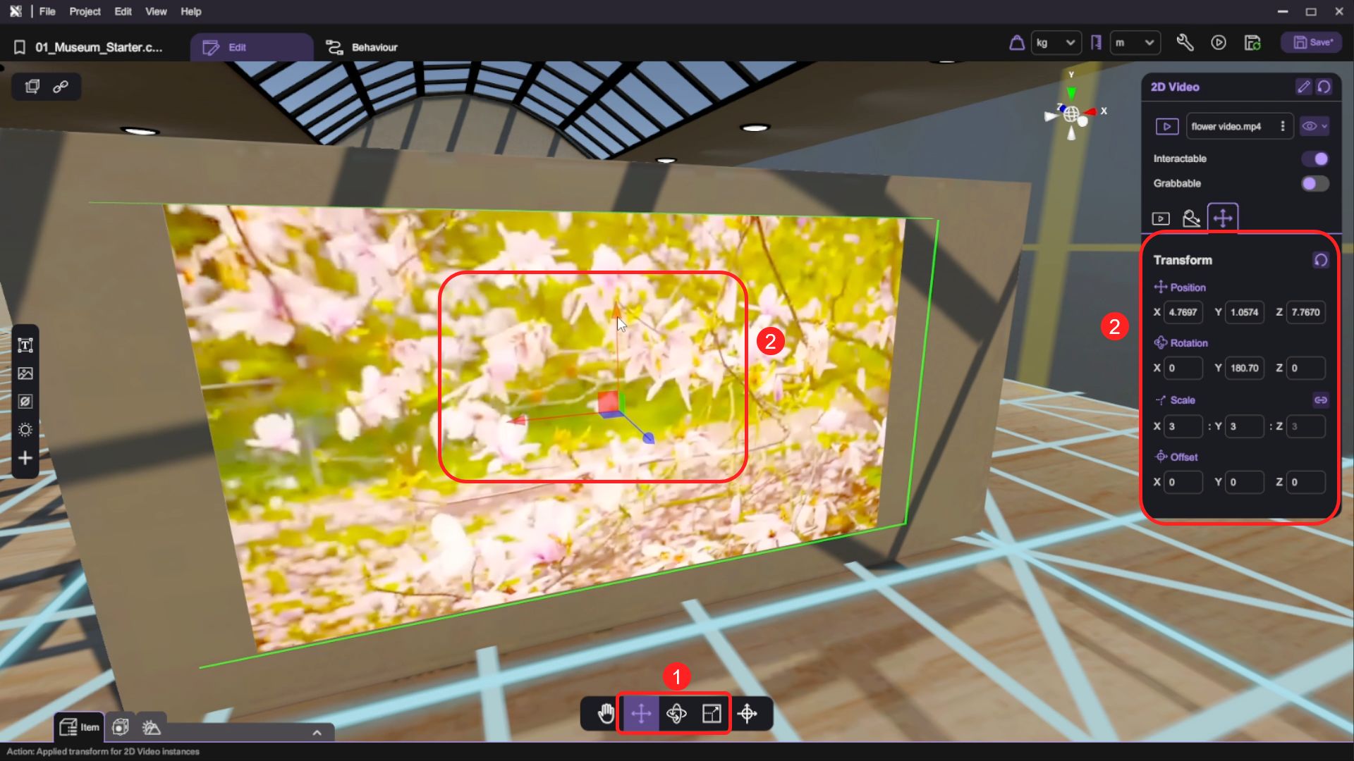 - Use the transform tools (move/rotate/scale) to reposition the 2D video object to the wall on the middle row.