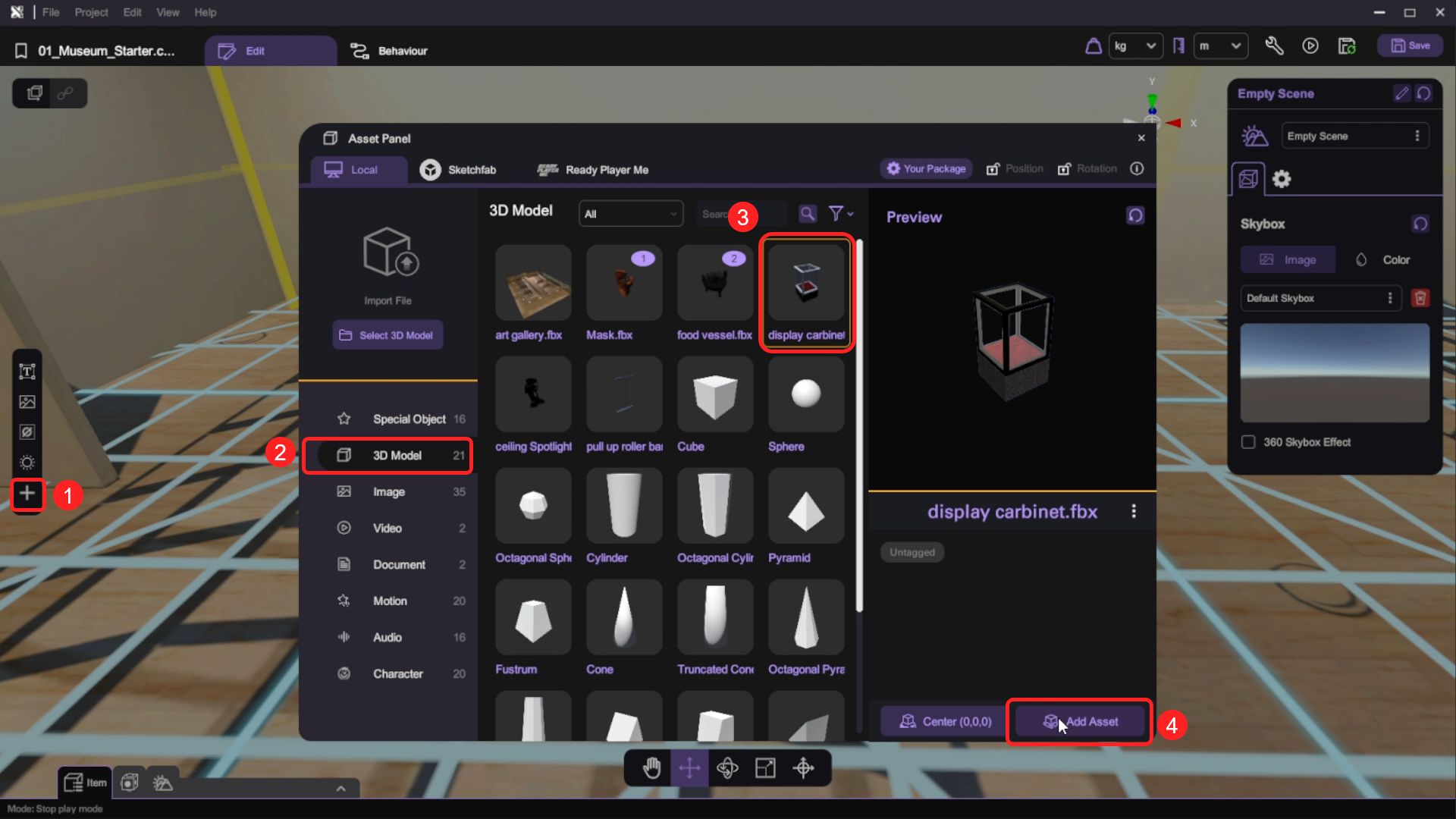 - Open the "Asset Panel" and select "3D Model" tab, select and add the "display cabinet.fbx" 3D model to the scene.