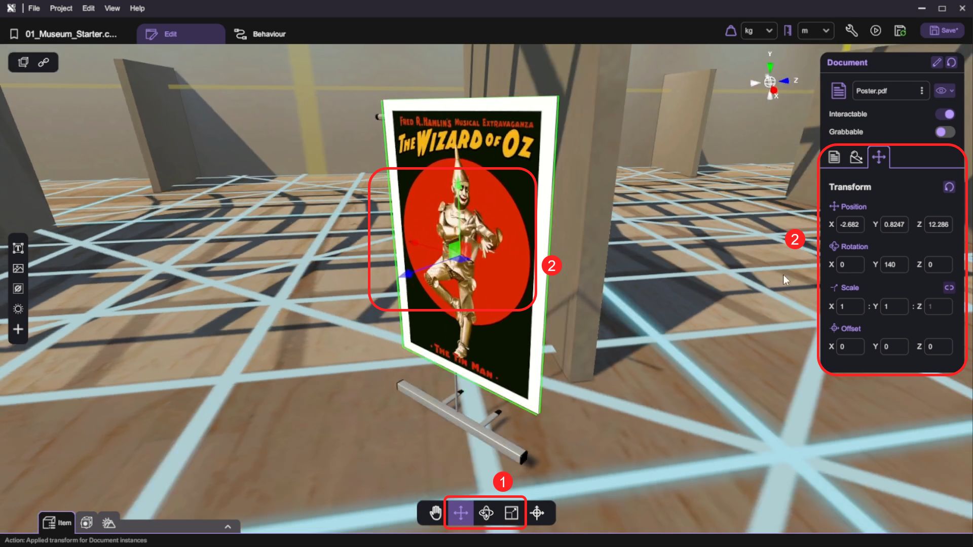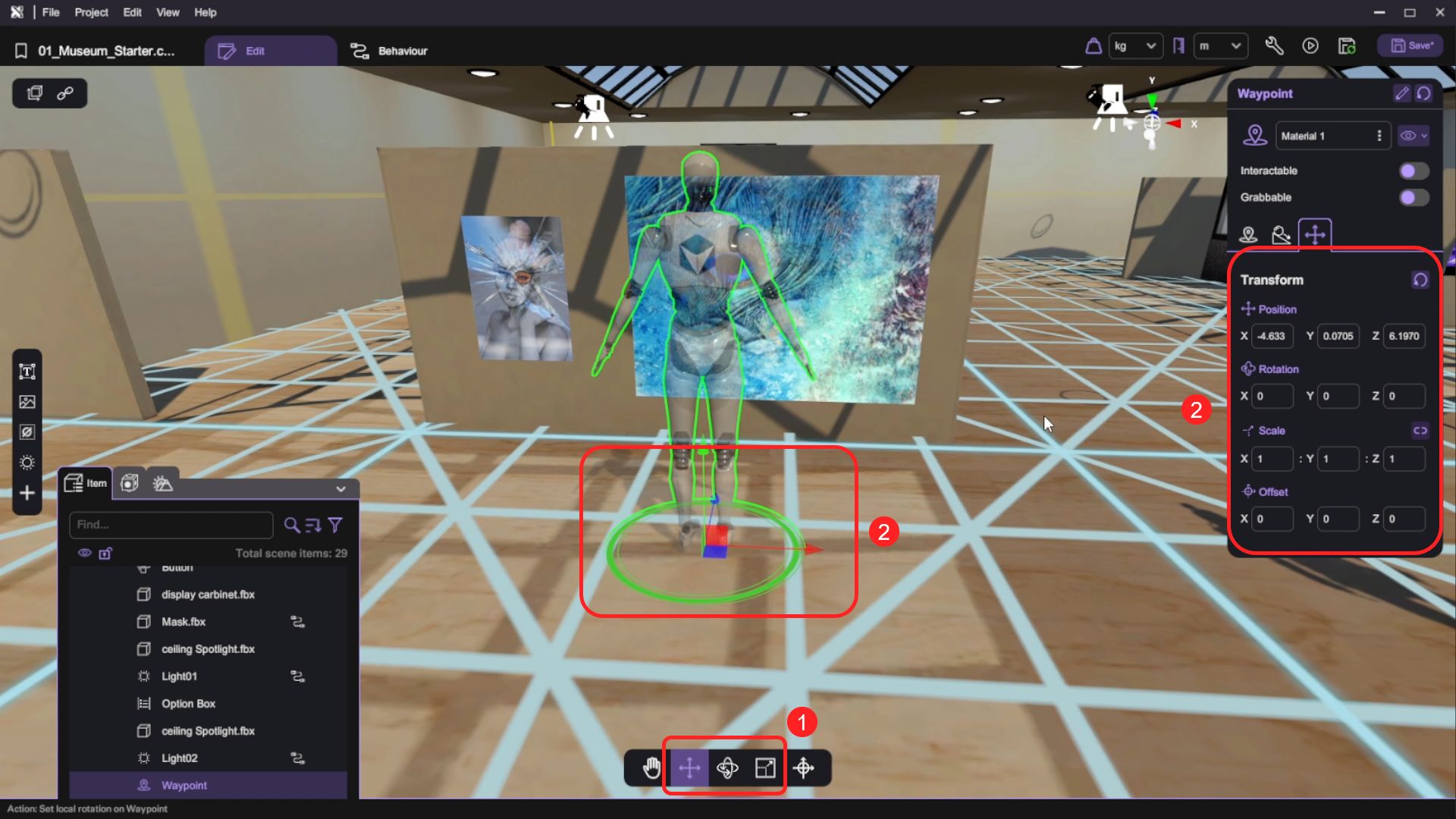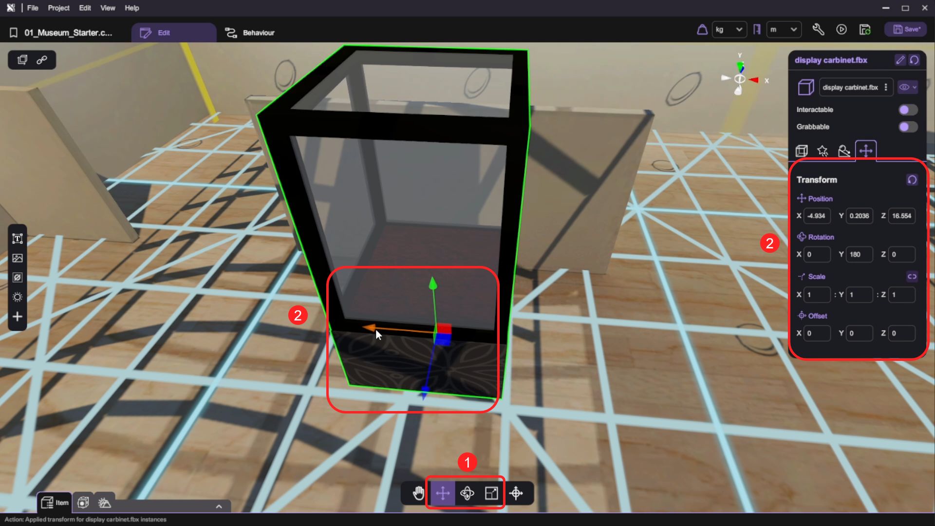 - Use the transform tools (move/rotate/scale) to place the display cabinet object to the front of the art gallery near the front wall.