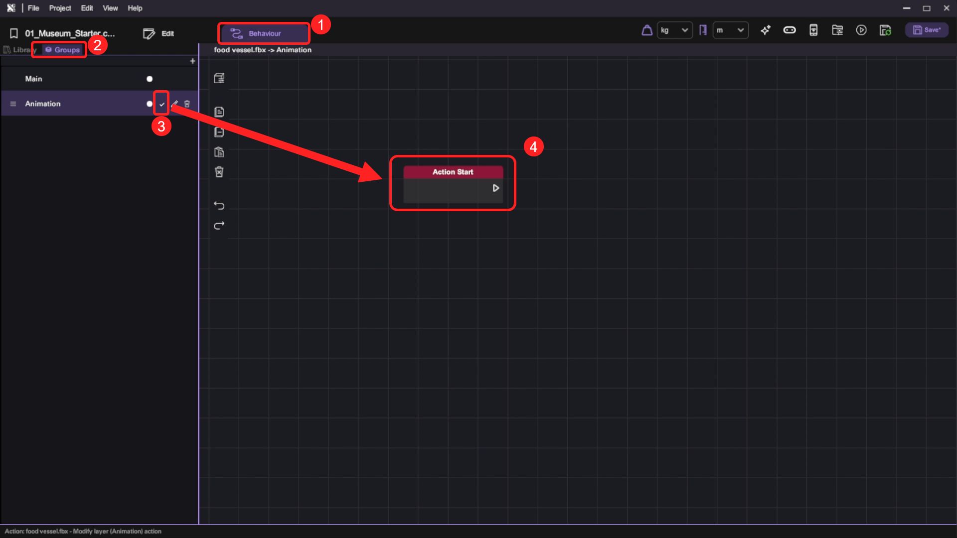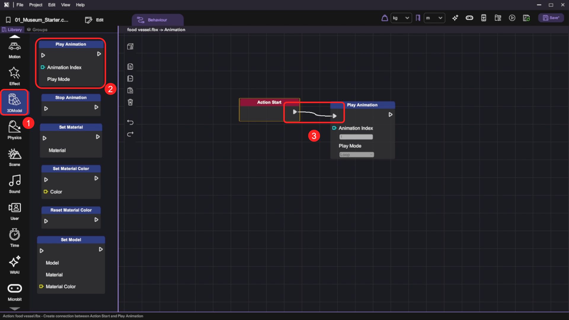 - Select the food vessel object and open its behaviour panel. Add a new action called "Animation" under the behaviour "Groups". Switch to behaviour library and select the "3D Model" category, drag the "Play Animation" behaviour block and append it behind the "Action Start" block in the canvas.