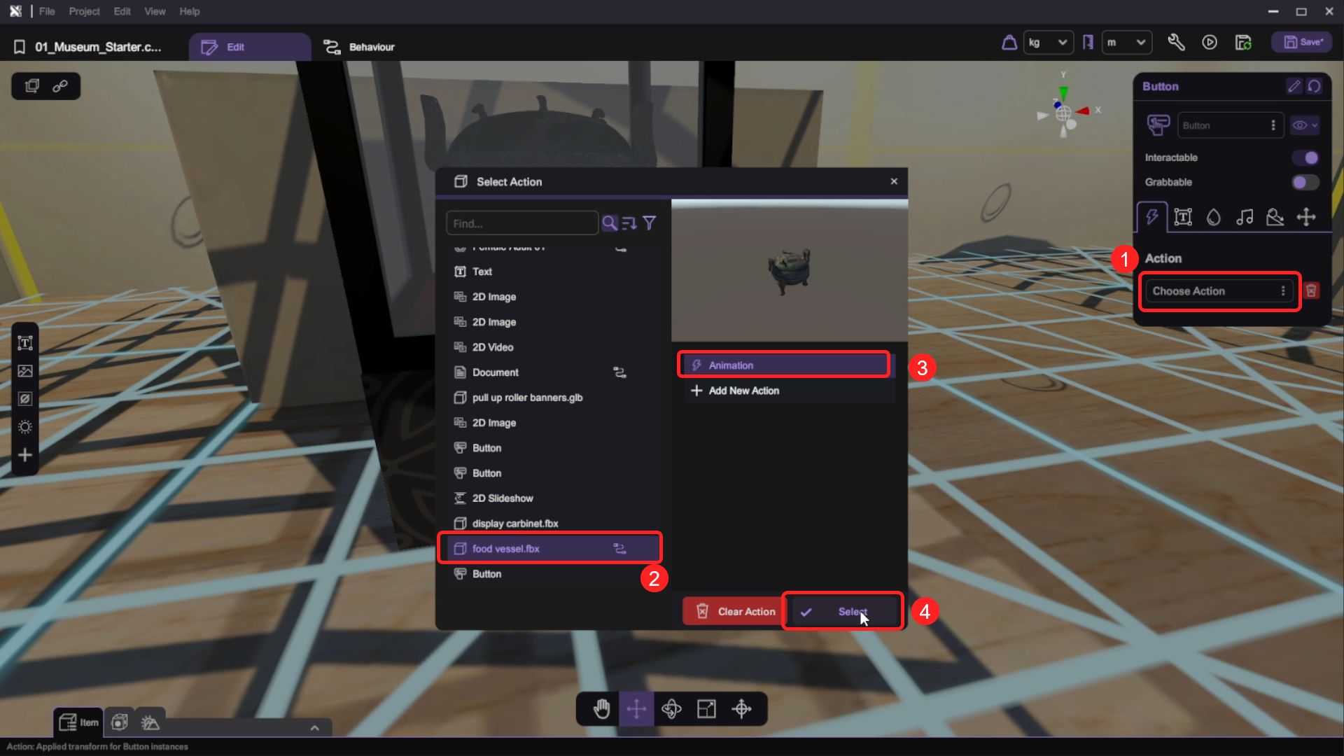 When the "Animation" action is called on, the food vessel object will play the animation that's embedded in the 3D model.