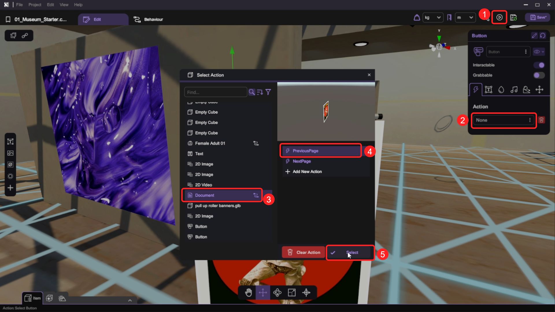 - Open the "Asset Panel" and from the "Special Objects" tab, select and add a "Button" to the scene. Use the transform tools to position the button object on the wall next to the document object.