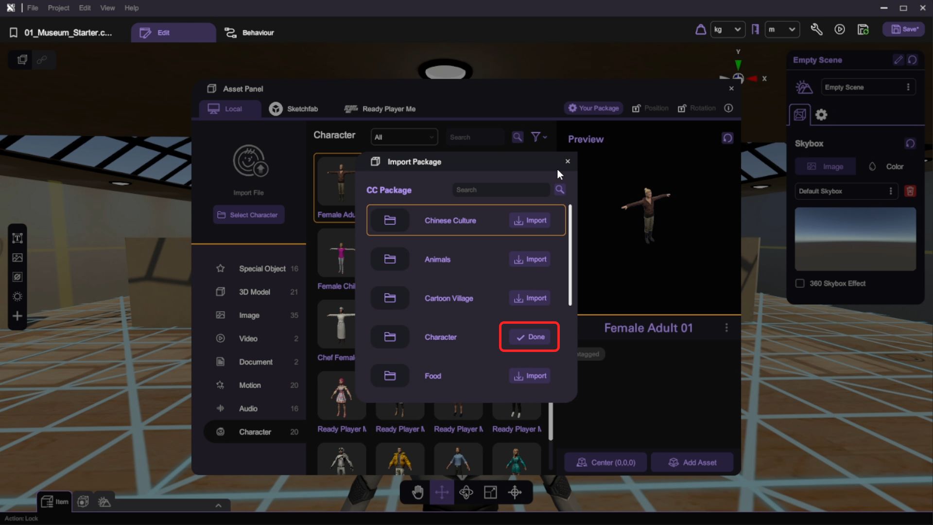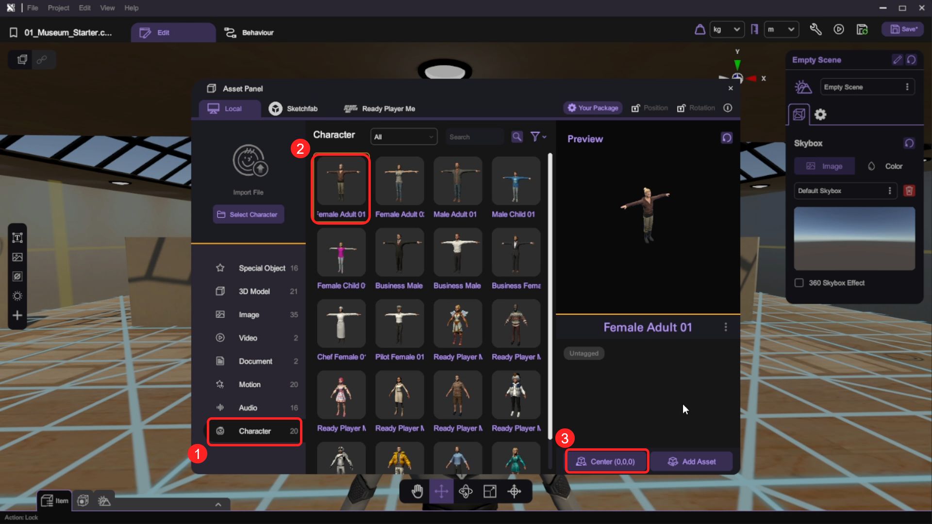 - Open the "Asset Panel" and from the "Default Assets" tab, select and add a Female Adult character model to the scene.