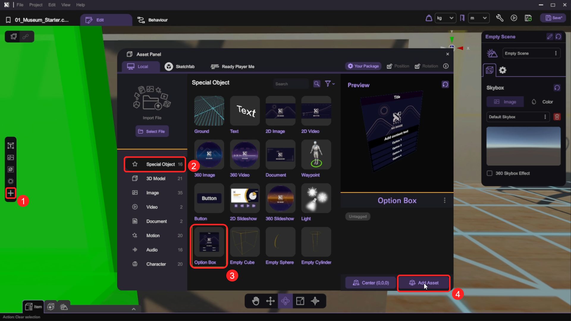 - Open the "Asset Panel" and from the "Special Objects" tab, select and add a "Option Box" to the scene.