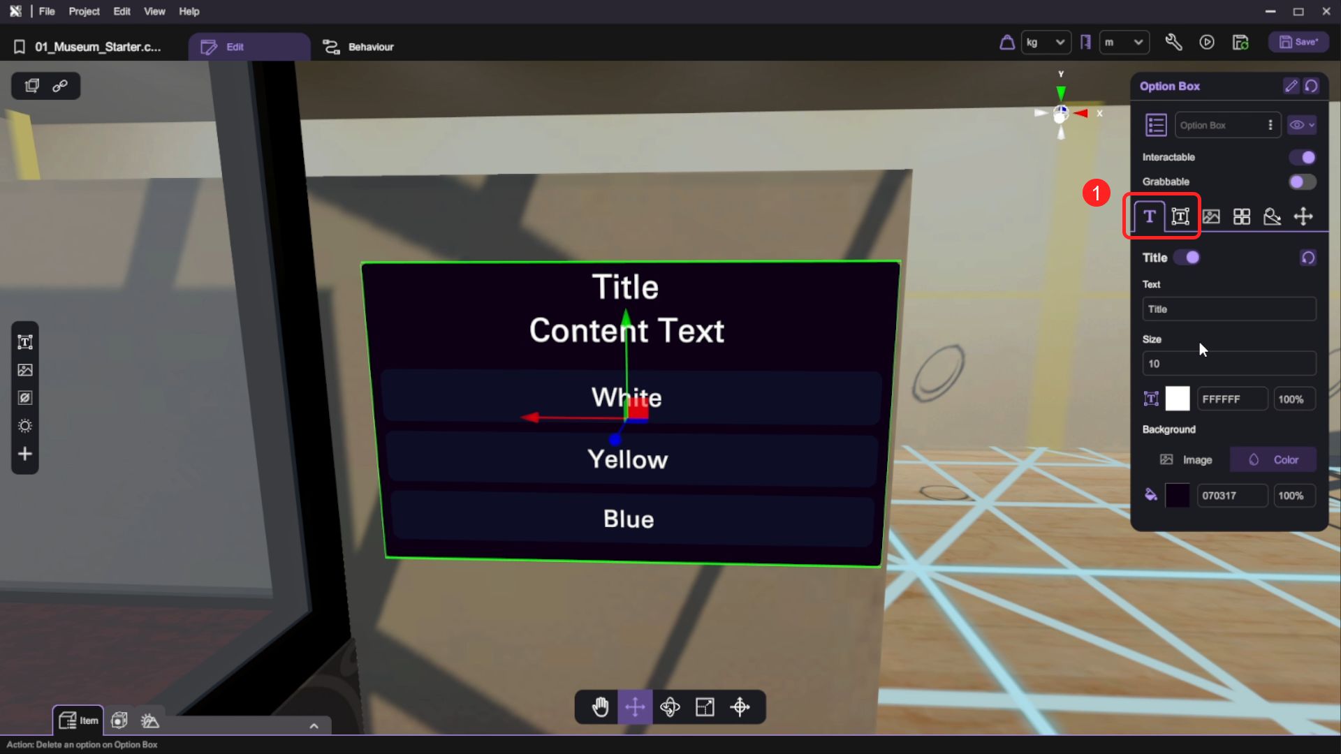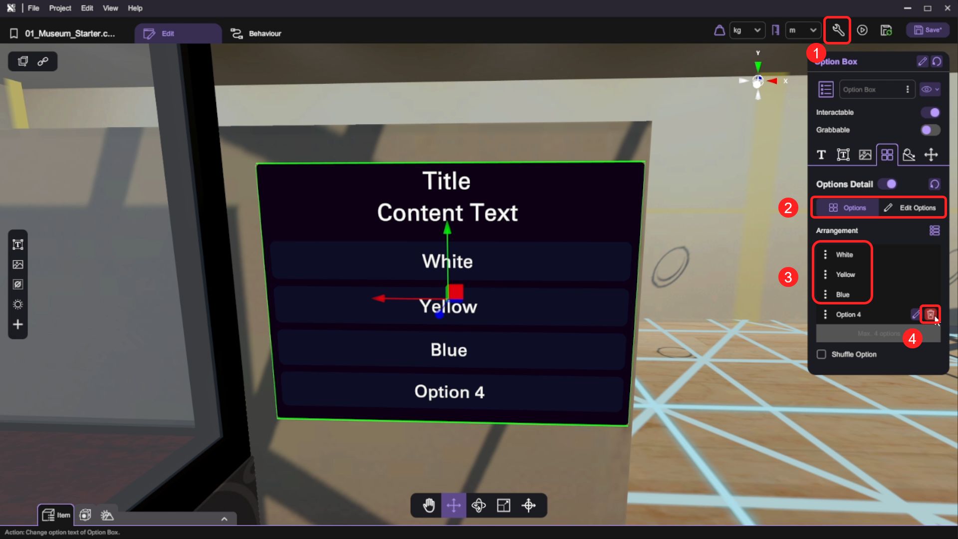 - Use the transform tools (move/rotate/scale) to place the option box to the center of the front wall between the two display cabinet objects. Open the "Inspector" and set up the details of the option box object. Under "Options" section in "Options Detail" tab, delete one option to make the "Total Options" to "3" to create 3 buttons on the option box, and click the Edit Options buttons next to the "Options" to switch between different option details.
