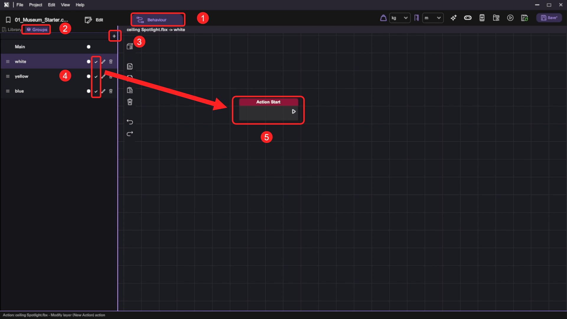 - Select the light and open its behaviour panel. Create 3 new actions and name them "white", "yellow", and "blue".