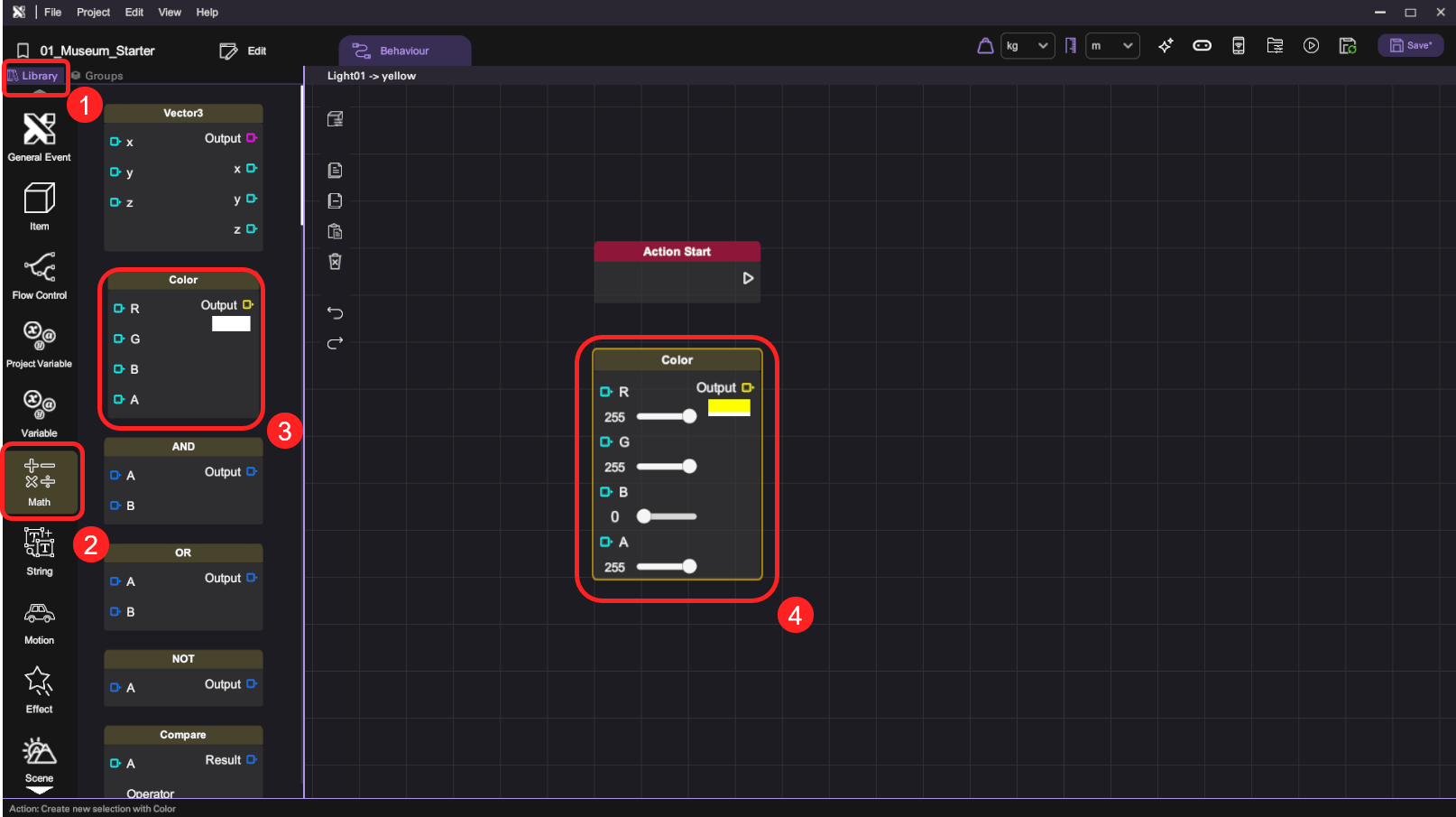 - Select the "yellow" action, then switch to the behaviour library, drag and drop a "Color" block under the "Math" category to the behaviour canvas under the "Action Start" block. Set the "B" (blue) value of the Color block to 0, the color preview under the "Output" node should show a yellow color.