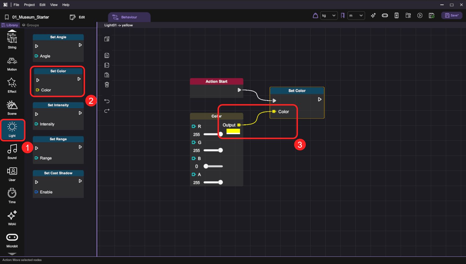 - Change to the "Light" category then drag and drop a "Set Color" block to the canvas. Connect the "Action Start" block's out flow node to the "Set Color" block's in flow node, then connect the "Color" block's "Output" node to the "Set Color" block's "Color" input node.